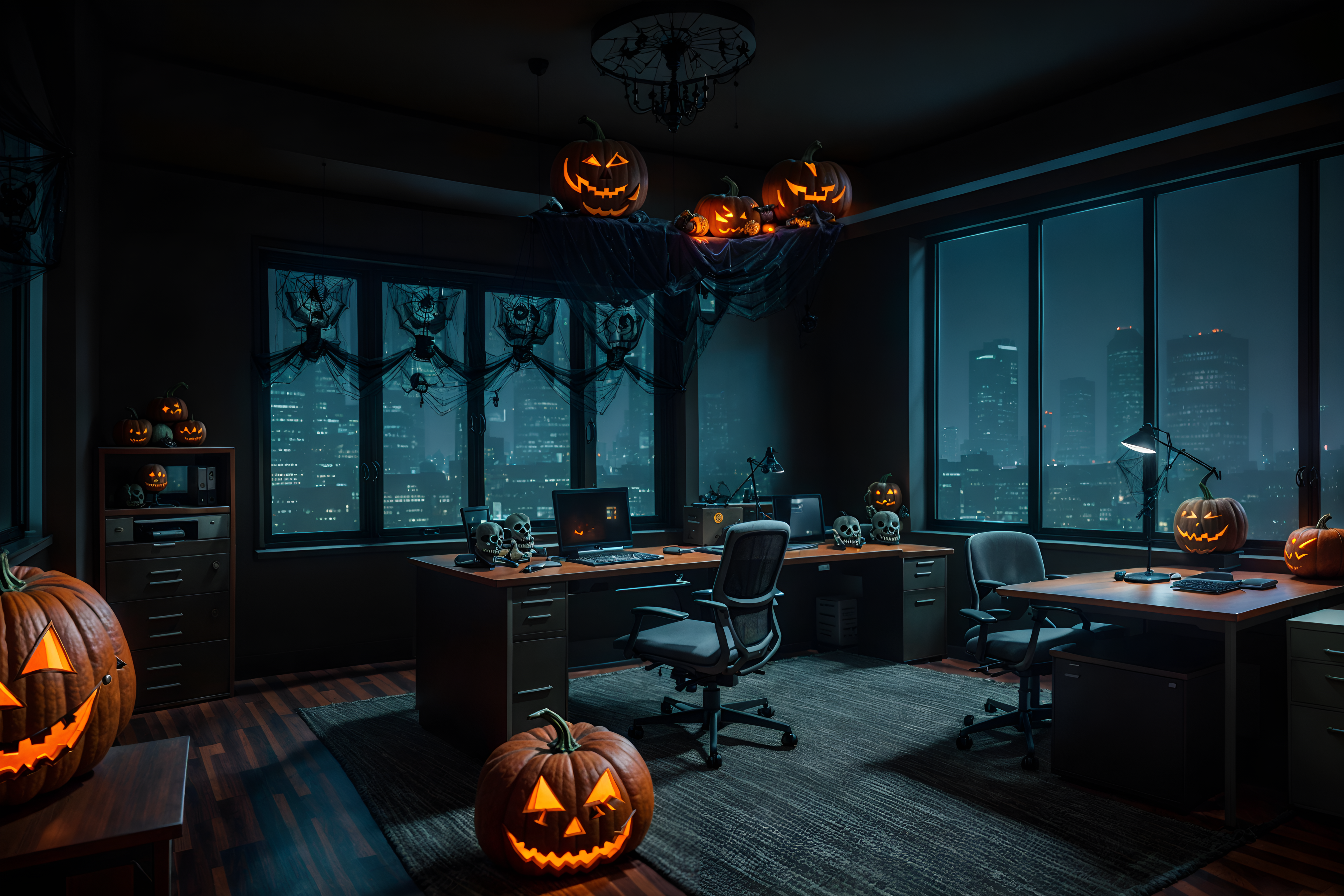 photo from pinterest of halloween-style interior designed (office interior) with office chairs and computer desks and windows and cabinets and lounge chairs and desk lamps and office desks and plants. . with glowing pumpkins and cobwebs and lanterns and human skulls and lanterns and skeletons sitting and standing and spiderwebs and cobwebs. . cinematic photo, highly detailed, cinematic lighting, ultra-detailed, ultrarealistic, photorealism, 8k. trending on pinterest. halloween interior design style. masterpiece, cinematic light, ultrarealistic+, photorealistic+, 8k, raw photo, realistic, sharp focus on eyes, (symmetrical eyes), (intact eyes), hyperrealistic, highest quality, best quality, , highly detailed, masterpiece, best quality, extremely detailed 8k wallpaper, masterpiece, best quality, ultra-detailed, best shadow, detailed background, detailed face, detailed eyes, high contrast, best illumination, detailed face, dulux, caustic, dynamic angle, detailed glow. dramatic lighting. highly detailed, insanely detailed hair, symmetrical, intricate details, professionally retouched, 8k high definition. strong bokeh. award winning photo.