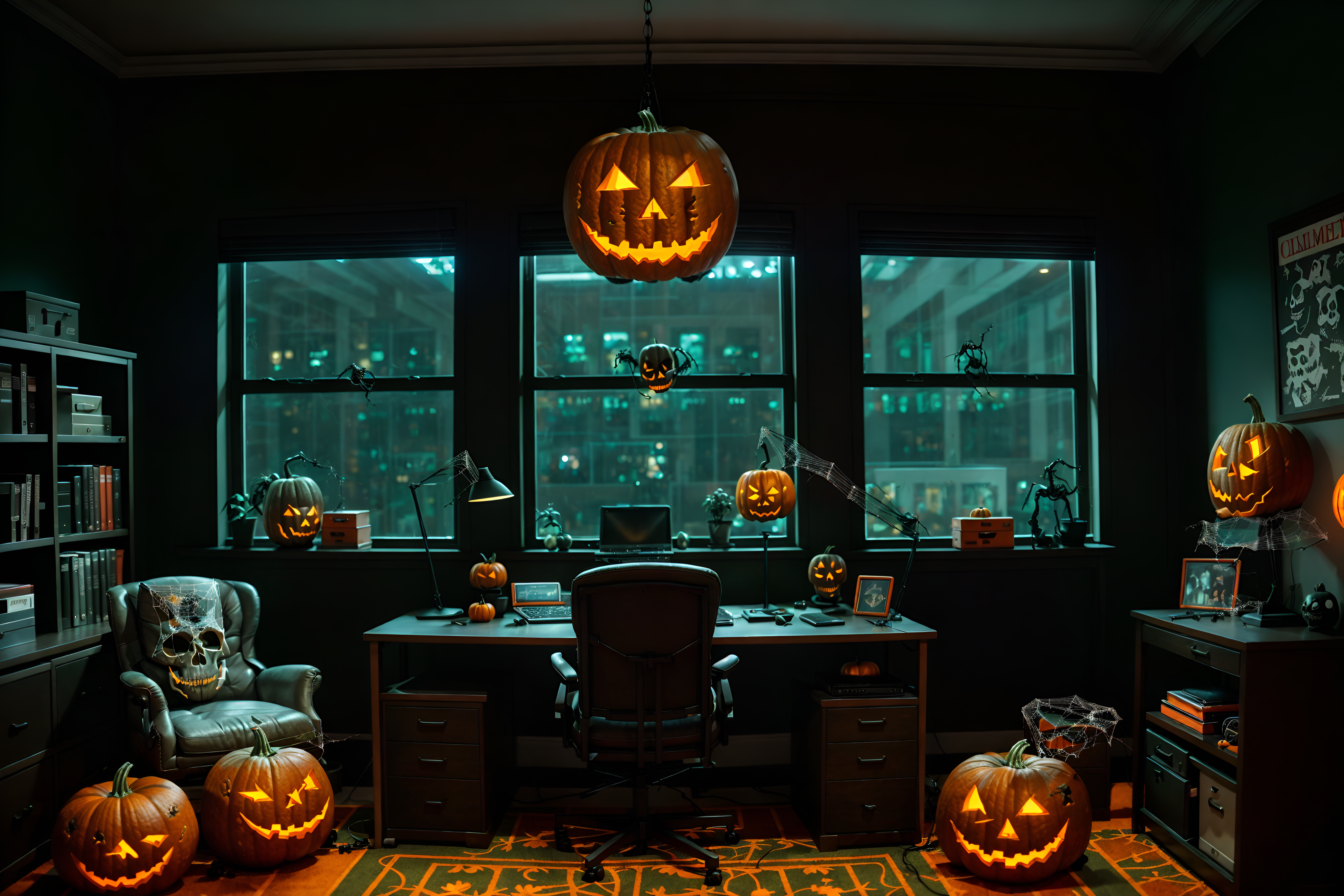 photo from pinterest of halloween-style interior designed (office interior) with office chairs and computer desks and windows and cabinets and lounge chairs and desk lamps and office desks and plants. . with glowing pumpkins and cobwebs and lanterns and human skulls and lanterns and skeletons sitting and standing and spiderwebs and cobwebs. . cinematic photo, highly detailed, cinematic lighting, ultra-detailed, ultrarealistic, photorealism, 8k. trending on pinterest. halloween interior design style. masterpiece, cinematic light, ultrarealistic+, photorealistic+, 8k, raw photo, realistic, sharp focus on eyes, (symmetrical eyes), (intact eyes), hyperrealistic, highest quality, best quality, , highly detailed, masterpiece, best quality, extremely detailed 8k wallpaper, masterpiece, best quality, ultra-detailed, best shadow, detailed background, detailed face, detailed eyes, high contrast, best illumination, detailed face, dulux, caustic, dynamic angle, detailed glow. dramatic lighting. highly detailed, insanely detailed hair, symmetrical, intricate details, professionally retouched, 8k high definition. strong bokeh. award winning photo.