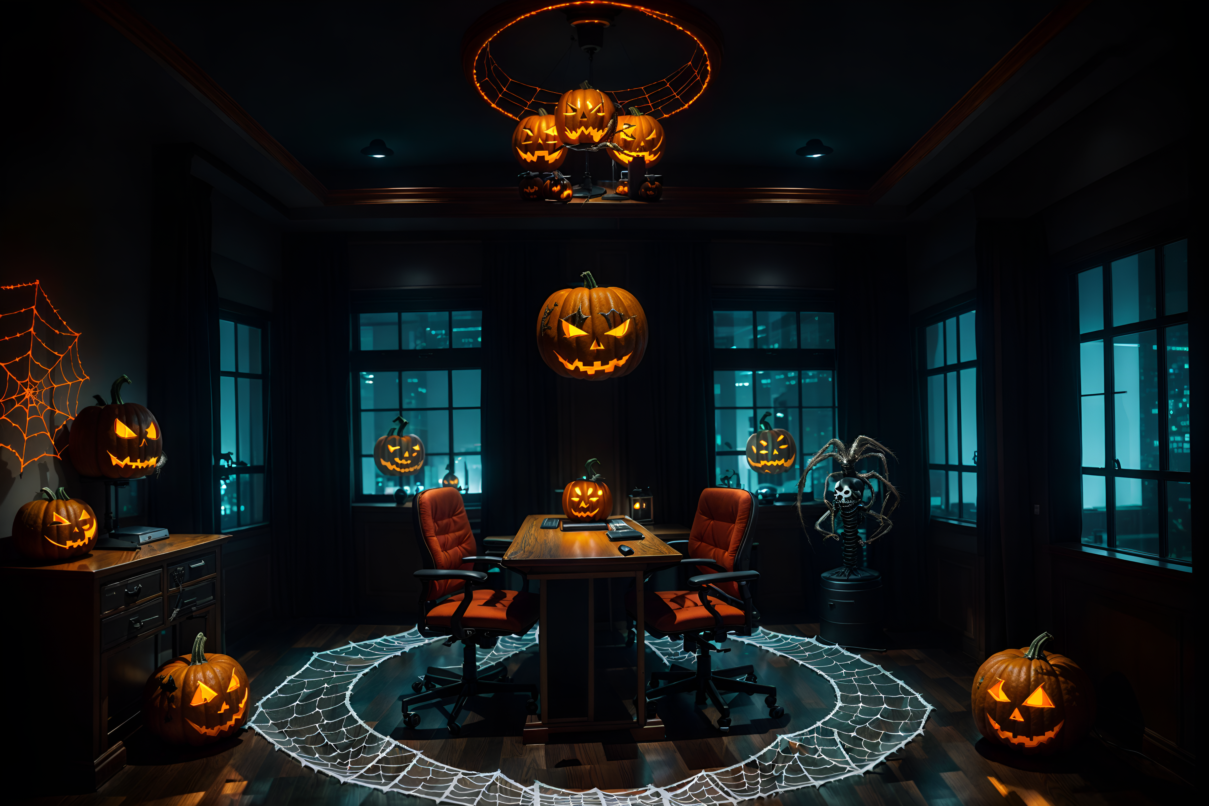 photo from pinterest of halloween-style interior designed (office interior) with office chairs and computer desks and windows and cabinets and lounge chairs and desk lamps and office desks and plants. . with glowing pumpkins and cobwebs and lanterns and human skulls and lanterns and skeletons sitting and standing and spiderwebs and cobwebs. . cinematic photo, highly detailed, cinematic lighting, ultra-detailed, ultrarealistic, photorealism, 8k. trending on pinterest. halloween interior design style. masterpiece, cinematic light, ultrarealistic+, photorealistic+, 8k, raw photo, realistic, sharp focus on eyes, (symmetrical eyes), (intact eyes), hyperrealistic, highest quality, best quality, , highly detailed, masterpiece, best quality, extremely detailed 8k wallpaper, masterpiece, best quality, ultra-detailed, best shadow, detailed background, detailed face, detailed eyes, high contrast, best illumination, detailed face, dulux, caustic, dynamic angle, detailed glow. dramatic lighting. highly detailed, insanely detailed hair, symmetrical, intricate details, professionally retouched, 8k high definition. strong bokeh. award winning photo.