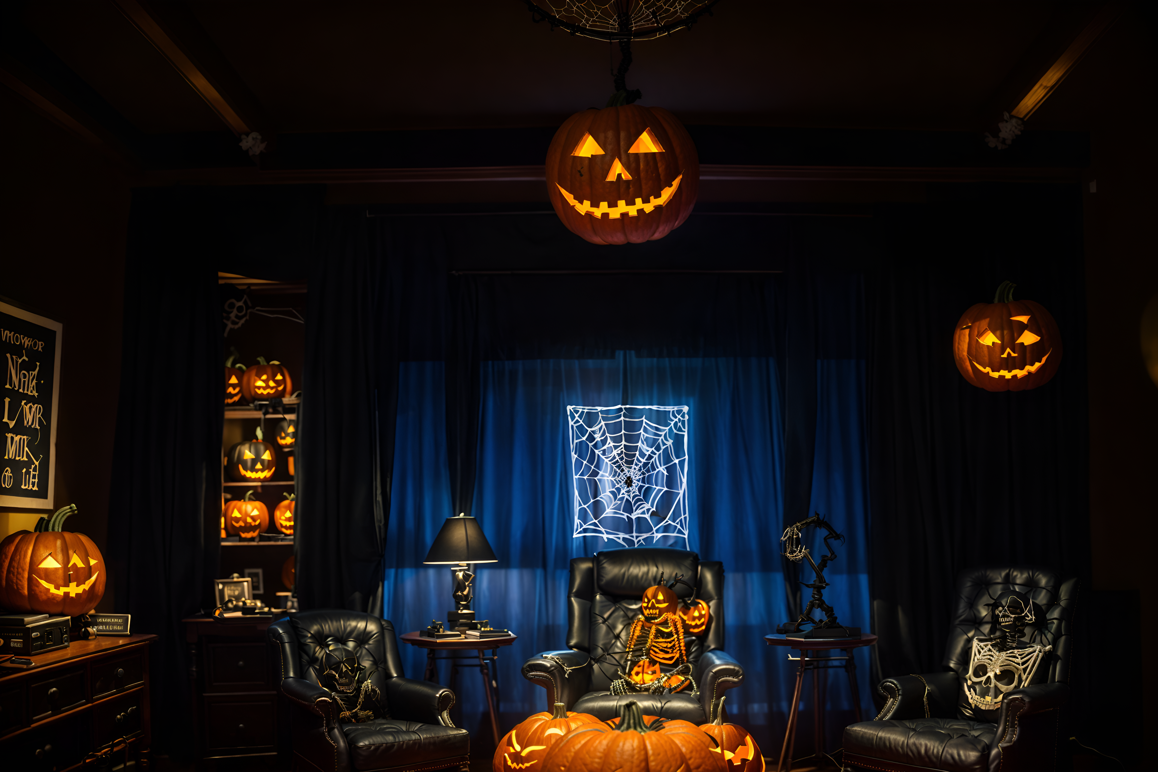 photo from pinterest of halloween-style interior designed (office interior) with office chairs and computer desks and windows and cabinets and lounge chairs and desk lamps and office desks and plants. . with glowing pumpkins and cobwebs and lanterns and human skulls and lanterns and skeletons sitting and standing and spiderwebs and cobwebs. . cinematic photo, highly detailed, cinematic lighting, ultra-detailed, ultrarealistic, photorealism, 8k. trending on pinterest. halloween interior design style. masterpiece, cinematic light, ultrarealistic+, photorealistic+, 8k, raw photo, realistic, sharp focus on eyes, (symmetrical eyes), (intact eyes), hyperrealistic, highest quality, best quality, , highly detailed, masterpiece, best quality, extremely detailed 8k wallpaper, masterpiece, best quality, ultra-detailed, best shadow, detailed background, detailed face, detailed eyes, high contrast, best illumination, detailed face, dulux, caustic, dynamic angle, detailed glow. dramatic lighting. highly detailed, insanely detailed hair, symmetrical, intricate details, professionally retouched, 8k high definition. strong bokeh. award winning photo.