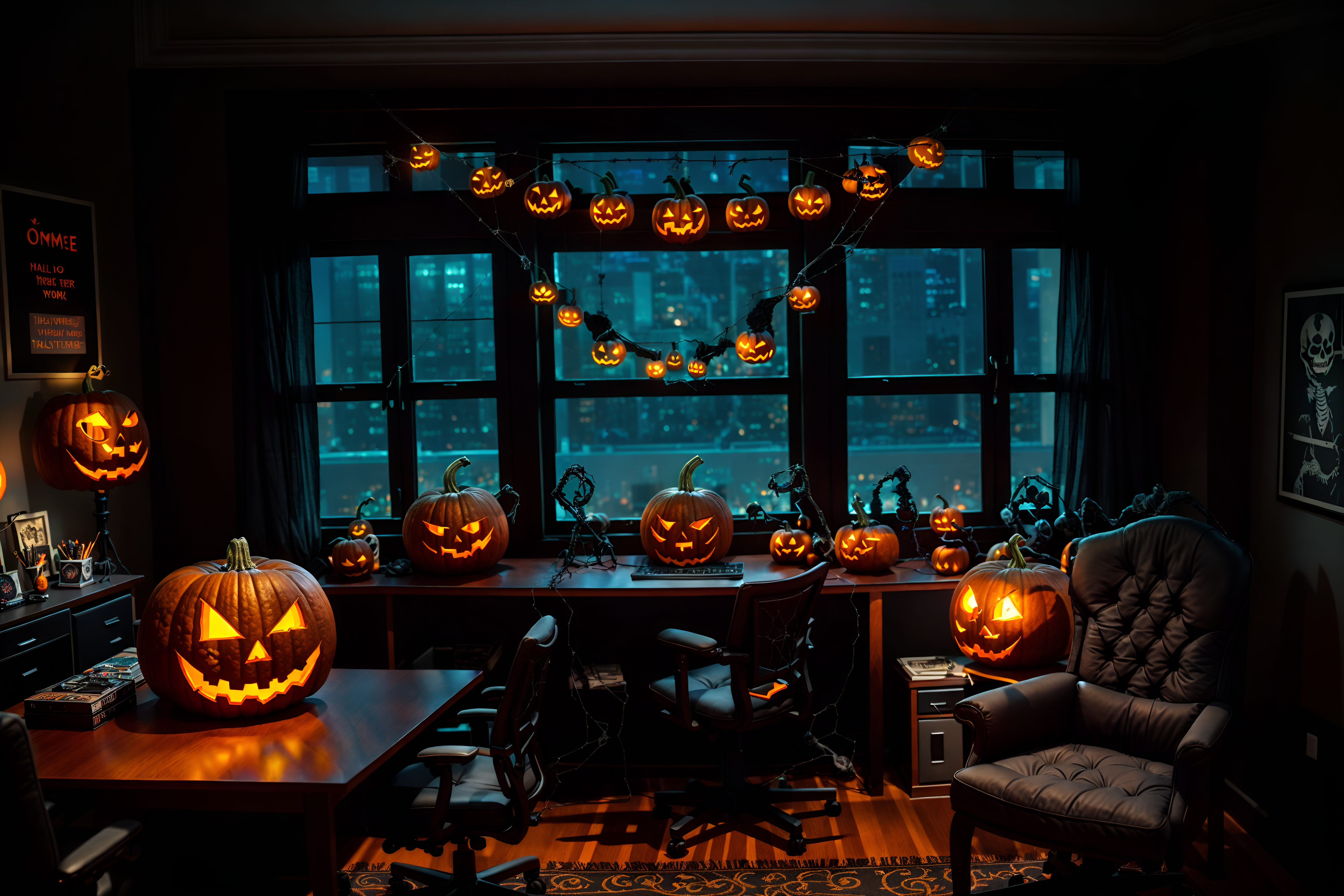 photo from pinterest of halloween-style interior designed (office interior) with office chairs and computer desks and windows and cabinets and lounge chairs and desk lamps and office desks and plants. . with glowing pumpkins and cobwebs and lanterns and human skulls and lanterns and skeletons sitting and standing and spiderwebs and cobwebs. . cinematic photo, highly detailed, cinematic lighting, ultra-detailed, ultrarealistic, photorealism, 8k. trending on pinterest. halloween interior design style. masterpiece, cinematic light, ultrarealistic+, photorealistic+, 8k, raw photo, realistic, sharp focus on eyes, (symmetrical eyes), (intact eyes), hyperrealistic, highest quality, best quality, , highly detailed, masterpiece, best quality, extremely detailed 8k wallpaper, masterpiece, best quality, ultra-detailed, best shadow, detailed background, detailed face, detailed eyes, high contrast, best illumination, detailed face, dulux, caustic, dynamic angle, detailed glow. dramatic lighting. highly detailed, insanely detailed hair, symmetrical, intricate details, professionally retouched, 8k high definition. strong bokeh. award winning photo.