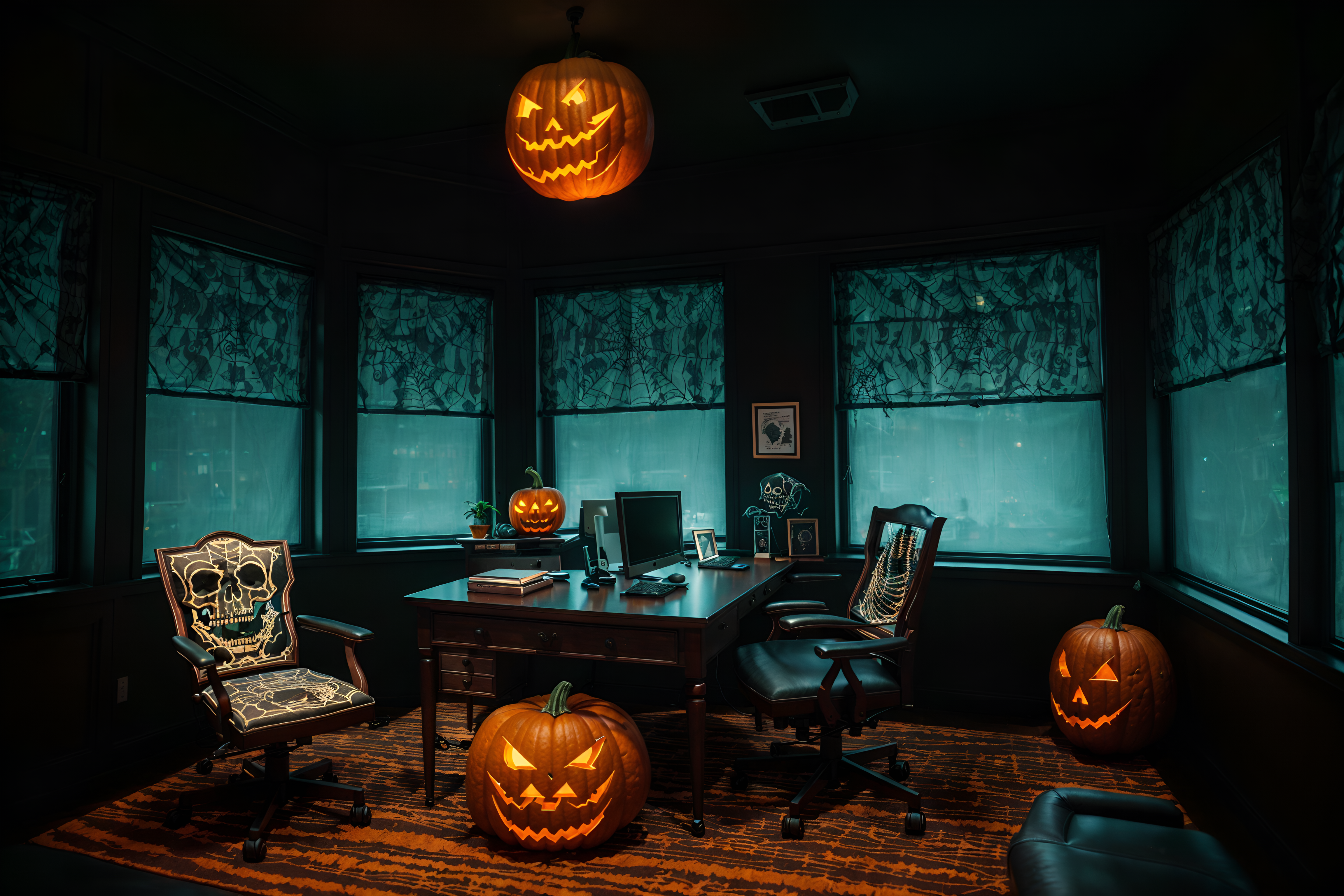 photo from pinterest of halloween-style interior designed (office interior) with office chairs and computer desks and windows and cabinets and lounge chairs and desk lamps and office desks and plants. . with glowing pumpkins and cobwebs and lanterns and human skulls and lanterns and skeletons sitting and standing and spiderwebs and cobwebs. . cinematic photo, highly detailed, cinematic lighting, ultra-detailed, ultrarealistic, photorealism, 8k. trending on pinterest. halloween interior design style. masterpiece, cinematic light, ultrarealistic+, photorealistic+, 8k, raw photo, realistic, sharp focus on eyes, (symmetrical eyes), (intact eyes), hyperrealistic, highest quality, best quality, , highly detailed, masterpiece, best quality, extremely detailed 8k wallpaper, masterpiece, best quality, ultra-detailed, best shadow, detailed background, detailed face, detailed eyes, high contrast, best illumination, detailed face, dulux, caustic, dynamic angle, detailed glow. dramatic lighting. highly detailed, insanely detailed hair, symmetrical, intricate details, professionally retouched, 8k high definition. strong bokeh. award winning photo.