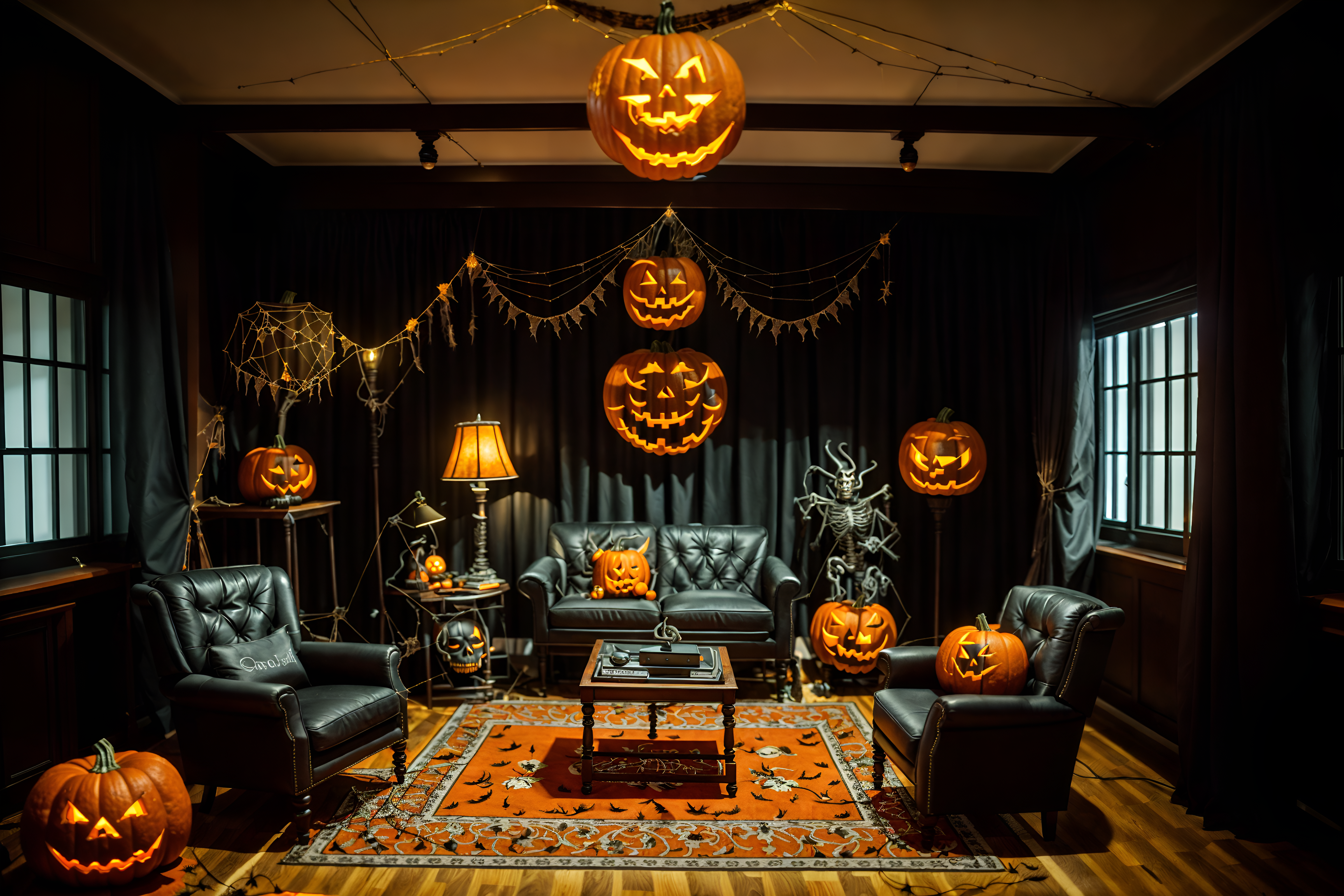 photo from pinterest of halloween-style interior designed (office interior) with office chairs and computer desks and windows and cabinets and lounge chairs and desk lamps and office desks and plants. . with glowing pumpkins and cobwebs and lanterns and human skulls and lanterns and skeletons sitting and standing and spiderwebs and cobwebs. . cinematic photo, highly detailed, cinematic lighting, ultra-detailed, ultrarealistic, photorealism, 8k. trending on pinterest. halloween interior design style. masterpiece, cinematic light, ultrarealistic+, photorealistic+, 8k, raw photo, realistic, sharp focus on eyes, (symmetrical eyes), (intact eyes), hyperrealistic, highest quality, best quality, , highly detailed, masterpiece, best quality, extremely detailed 8k wallpaper, masterpiece, best quality, ultra-detailed, best shadow, detailed background, detailed face, detailed eyes, high contrast, best illumination, detailed face, dulux, caustic, dynamic angle, detailed glow. dramatic lighting. highly detailed, insanely detailed hair, symmetrical, intricate details, professionally retouched, 8k high definition. strong bokeh. award winning photo.