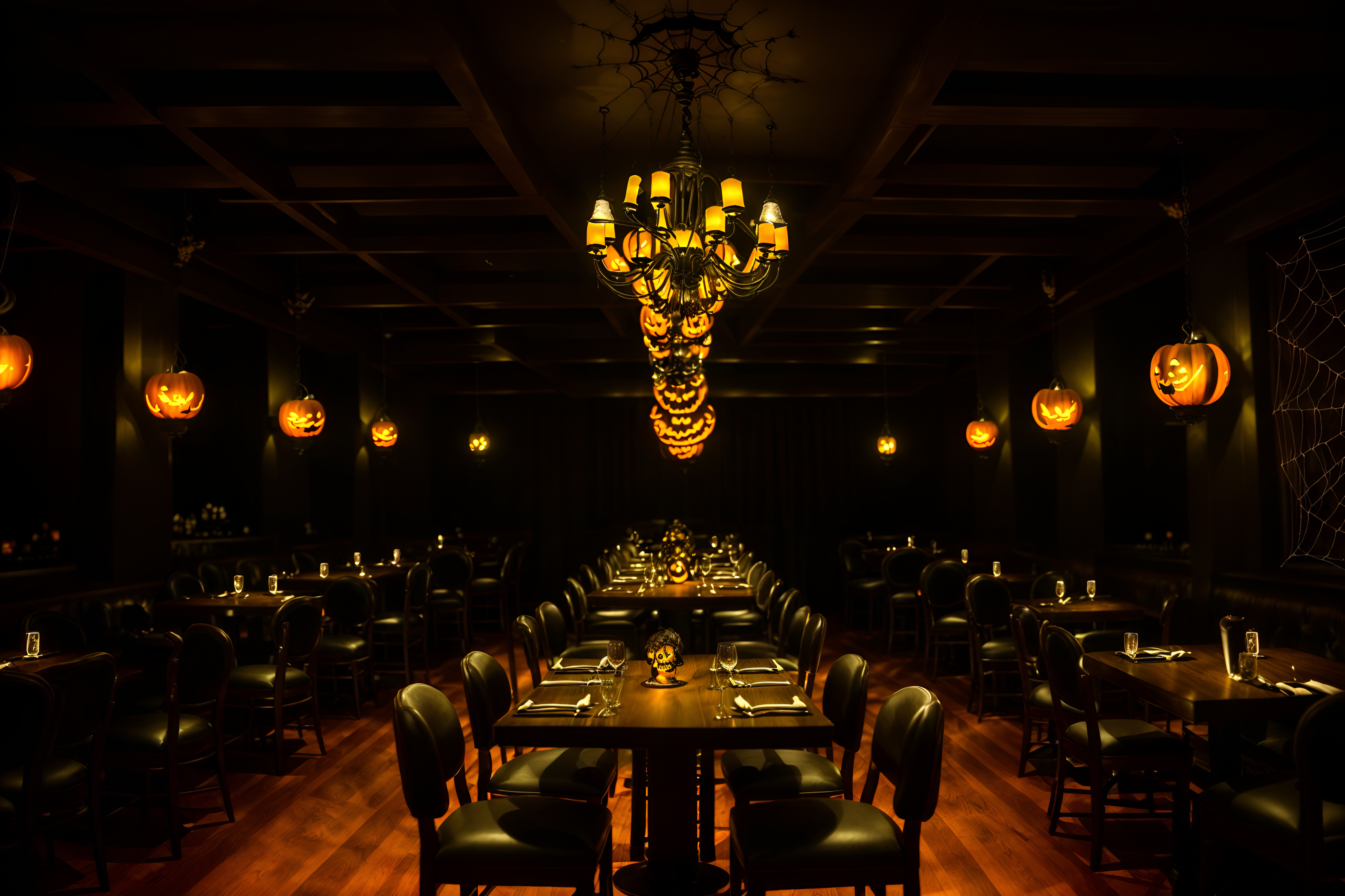 photo from pinterest of halloween-style interior designed (restaurant interior) with restaurant chairs and restaurant bar and restaurant decor and restaurant dining tables and restaurant chairs. . with glowing pumpkins and skeletons sitting and standing and lanterns and human skulls and spiderwebs and lanterns and cobwebs and yellow black balloons. . cinematic photo, highly detailed, cinematic lighting, ultra-detailed, ultrarealistic, photorealism, 8k. trending on pinterest. halloween interior design style. masterpiece, cinematic light, ultrarealistic+, photorealistic+, 8k, raw photo, realistic, sharp focus on eyes, (symmetrical eyes), (intact eyes), hyperrealistic, highest quality, best quality, , highly detailed, masterpiece, best quality, extremely detailed 8k wallpaper, masterpiece, best quality, ultra-detailed, best shadow, detailed background, detailed face, detailed eyes, high contrast, best illumination, detailed face, dulux, caustic, dynamic angle, detailed glow. dramatic lighting. highly detailed, insanely detailed hair, symmetrical, intricate details, professionally retouched, 8k high definition. strong bokeh. award winning photo.