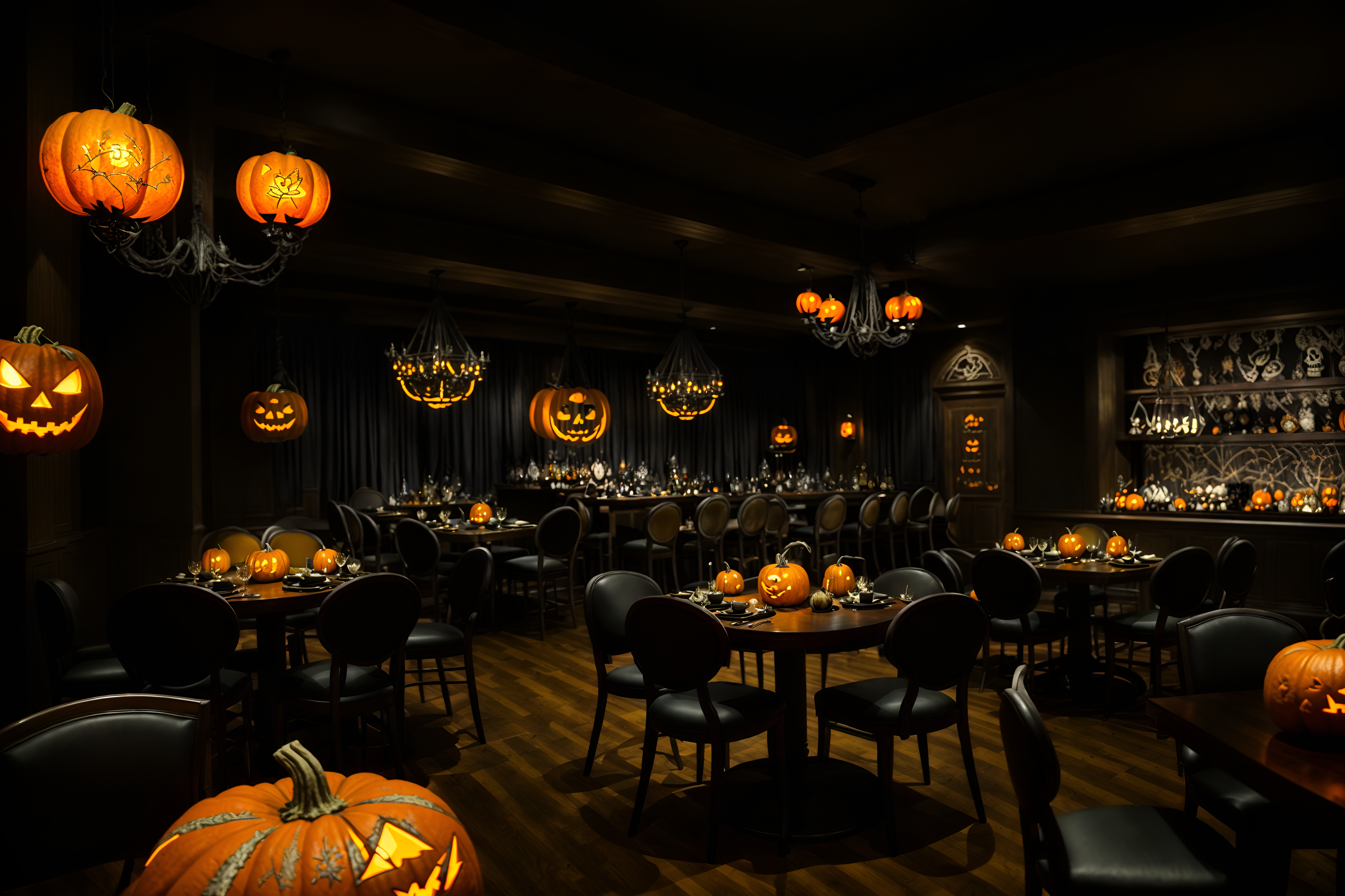 photo from pinterest of halloween-style interior designed (restaurant interior) with restaurant chairs and restaurant bar and restaurant decor and restaurant dining tables and restaurant chairs. . with glowing pumpkins and skeletons sitting and standing and lanterns and human skulls and spiderwebs and lanterns and cobwebs and yellow black balloons. . cinematic photo, highly detailed, cinematic lighting, ultra-detailed, ultrarealistic, photorealism, 8k. trending on pinterest. halloween interior design style. masterpiece, cinematic light, ultrarealistic+, photorealistic+, 8k, raw photo, realistic, sharp focus on eyes, (symmetrical eyes), (intact eyes), hyperrealistic, highest quality, best quality, , highly detailed, masterpiece, best quality, extremely detailed 8k wallpaper, masterpiece, best quality, ultra-detailed, best shadow, detailed background, detailed face, detailed eyes, high contrast, best illumination, detailed face, dulux, caustic, dynamic angle, detailed glow. dramatic lighting. highly detailed, insanely detailed hair, symmetrical, intricate details, professionally retouched, 8k high definition. strong bokeh. award winning photo.