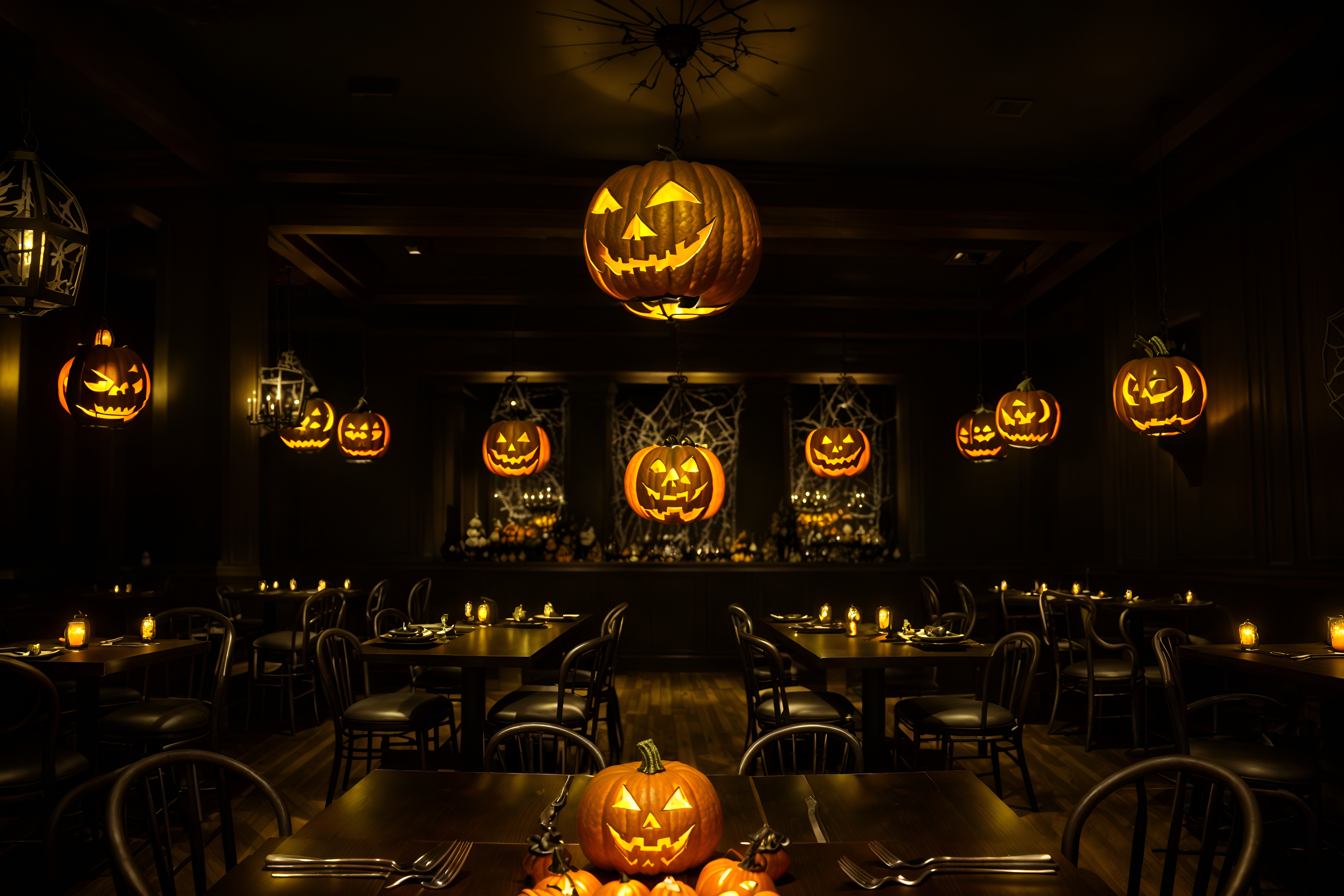 photo from pinterest of halloween-style interior designed (restaurant interior) with restaurant chairs and restaurant bar and restaurant decor and restaurant dining tables and restaurant chairs. . with glowing pumpkins and skeletons sitting and standing and lanterns and human skulls and spiderwebs and lanterns and cobwebs and yellow black balloons. . cinematic photo, highly detailed, cinematic lighting, ultra-detailed, ultrarealistic, photorealism, 8k. trending on pinterest. halloween interior design style. masterpiece, cinematic light, ultrarealistic+, photorealistic+, 8k, raw photo, realistic, sharp focus on eyes, (symmetrical eyes), (intact eyes), hyperrealistic, highest quality, best quality, , highly detailed, masterpiece, best quality, extremely detailed 8k wallpaper, masterpiece, best quality, ultra-detailed, best shadow, detailed background, detailed face, detailed eyes, high contrast, best illumination, detailed face, dulux, caustic, dynamic angle, detailed glow. dramatic lighting. highly detailed, insanely detailed hair, symmetrical, intricate details, professionally retouched, 8k high definition. strong bokeh. award winning photo.