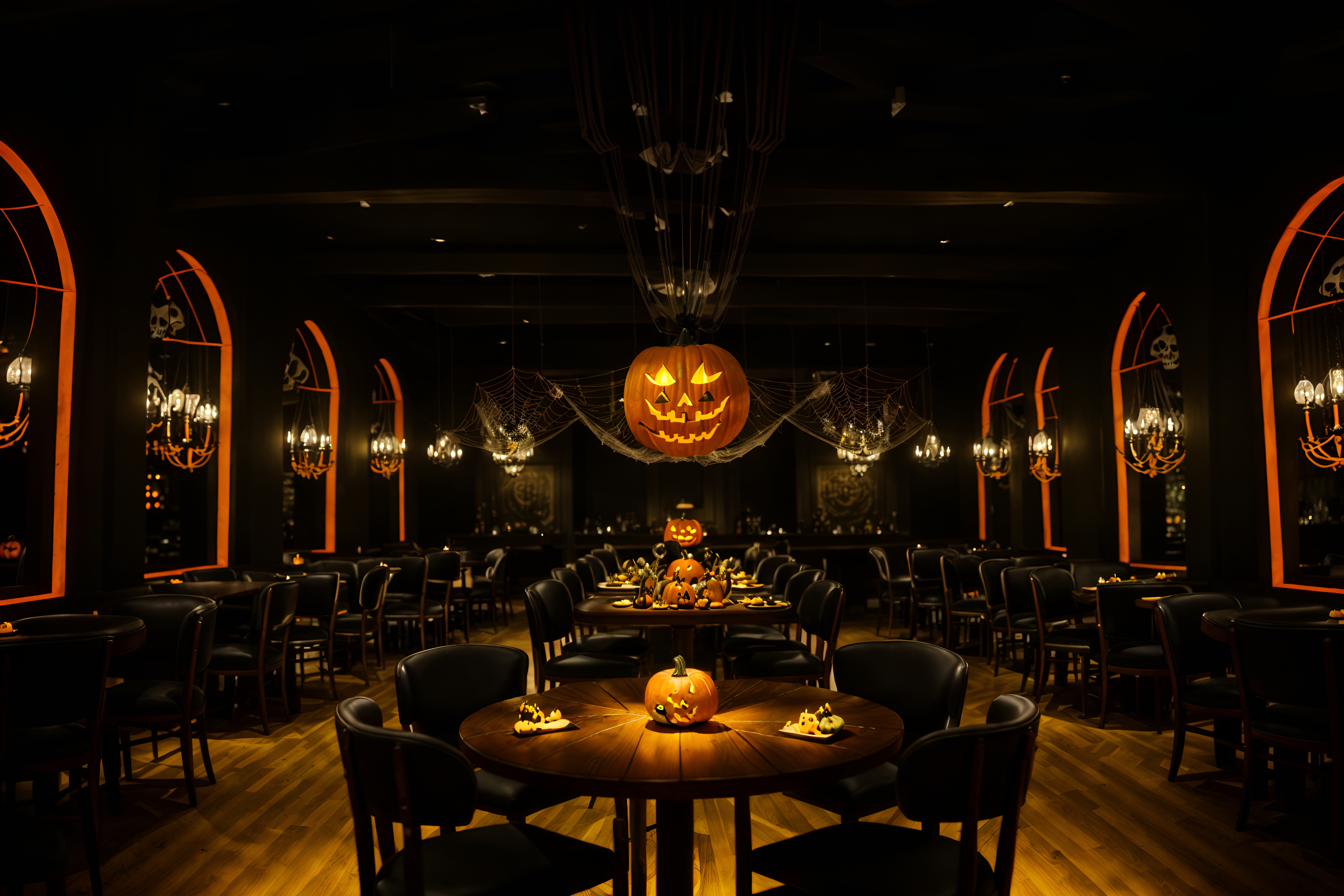 photo from pinterest of halloween-style interior designed (restaurant interior) with restaurant chairs and restaurant bar and restaurant decor and restaurant dining tables and restaurant chairs. . with glowing pumpkins and skeletons sitting and standing and lanterns and human skulls and spiderwebs and lanterns and cobwebs and yellow black balloons. . cinematic photo, highly detailed, cinematic lighting, ultra-detailed, ultrarealistic, photorealism, 8k. trending on pinterest. halloween interior design style. masterpiece, cinematic light, ultrarealistic+, photorealistic+, 8k, raw photo, realistic, sharp focus on eyes, (symmetrical eyes), (intact eyes), hyperrealistic, highest quality, best quality, , highly detailed, masterpiece, best quality, extremely detailed 8k wallpaper, masterpiece, best quality, ultra-detailed, best shadow, detailed background, detailed face, detailed eyes, high contrast, best illumination, detailed face, dulux, caustic, dynamic angle, detailed glow. dramatic lighting. highly detailed, insanely detailed hair, symmetrical, intricate details, professionally retouched, 8k high definition. strong bokeh. award winning photo.