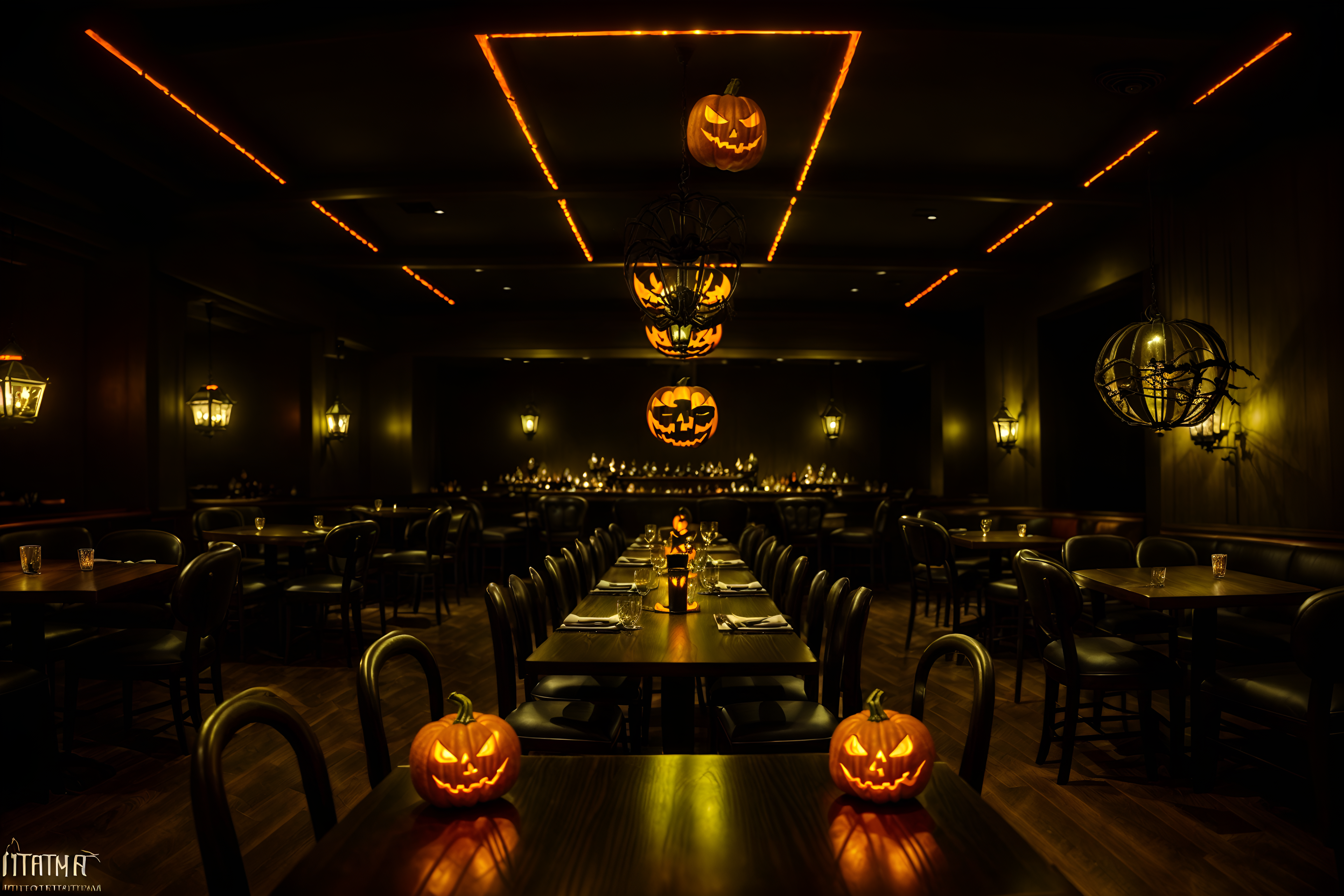 photo from pinterest of halloween-style interior designed (restaurant interior) with restaurant chairs and restaurant bar and restaurant decor and restaurant dining tables and restaurant chairs. . with glowing pumpkins and skeletons sitting and standing and lanterns and human skulls and spiderwebs and lanterns and cobwebs and yellow black balloons. . cinematic photo, highly detailed, cinematic lighting, ultra-detailed, ultrarealistic, photorealism, 8k. trending on pinterest. halloween interior design style. masterpiece, cinematic light, ultrarealistic+, photorealistic+, 8k, raw photo, realistic, sharp focus on eyes, (symmetrical eyes), (intact eyes), hyperrealistic, highest quality, best quality, , highly detailed, masterpiece, best quality, extremely detailed 8k wallpaper, masterpiece, best quality, ultra-detailed, best shadow, detailed background, detailed face, detailed eyes, high contrast, best illumination, detailed face, dulux, caustic, dynamic angle, detailed glow. dramatic lighting. highly detailed, insanely detailed hair, symmetrical, intricate details, professionally retouched, 8k high definition. strong bokeh. award winning photo.