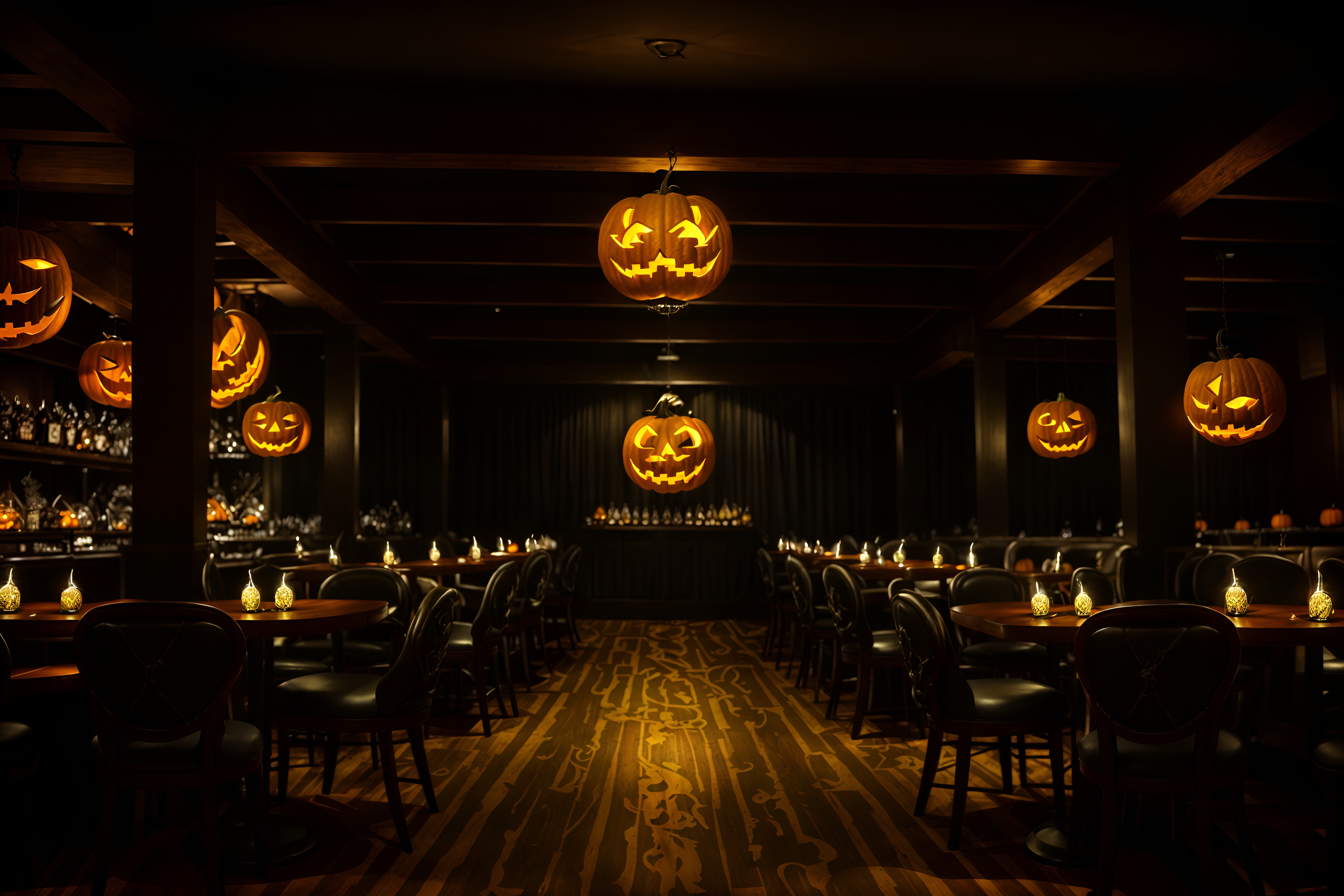 photo from pinterest of halloween-style interior designed (restaurant interior) with restaurant chairs and restaurant bar and restaurant decor and restaurant dining tables and restaurant chairs. . with glowing pumpkins and skeletons sitting and standing and lanterns and human skulls and spiderwebs and lanterns and cobwebs and yellow black balloons. . cinematic photo, highly detailed, cinematic lighting, ultra-detailed, ultrarealistic, photorealism, 8k. trending on pinterest. halloween interior design style. masterpiece, cinematic light, ultrarealistic+, photorealistic+, 8k, raw photo, realistic, sharp focus on eyes, (symmetrical eyes), (intact eyes), hyperrealistic, highest quality, best quality, , highly detailed, masterpiece, best quality, extremely detailed 8k wallpaper, masterpiece, best quality, ultra-detailed, best shadow, detailed background, detailed face, detailed eyes, high contrast, best illumination, detailed face, dulux, caustic, dynamic angle, detailed glow. dramatic lighting. highly detailed, insanely detailed hair, symmetrical, intricate details, professionally retouched, 8k high definition. strong bokeh. award winning photo.