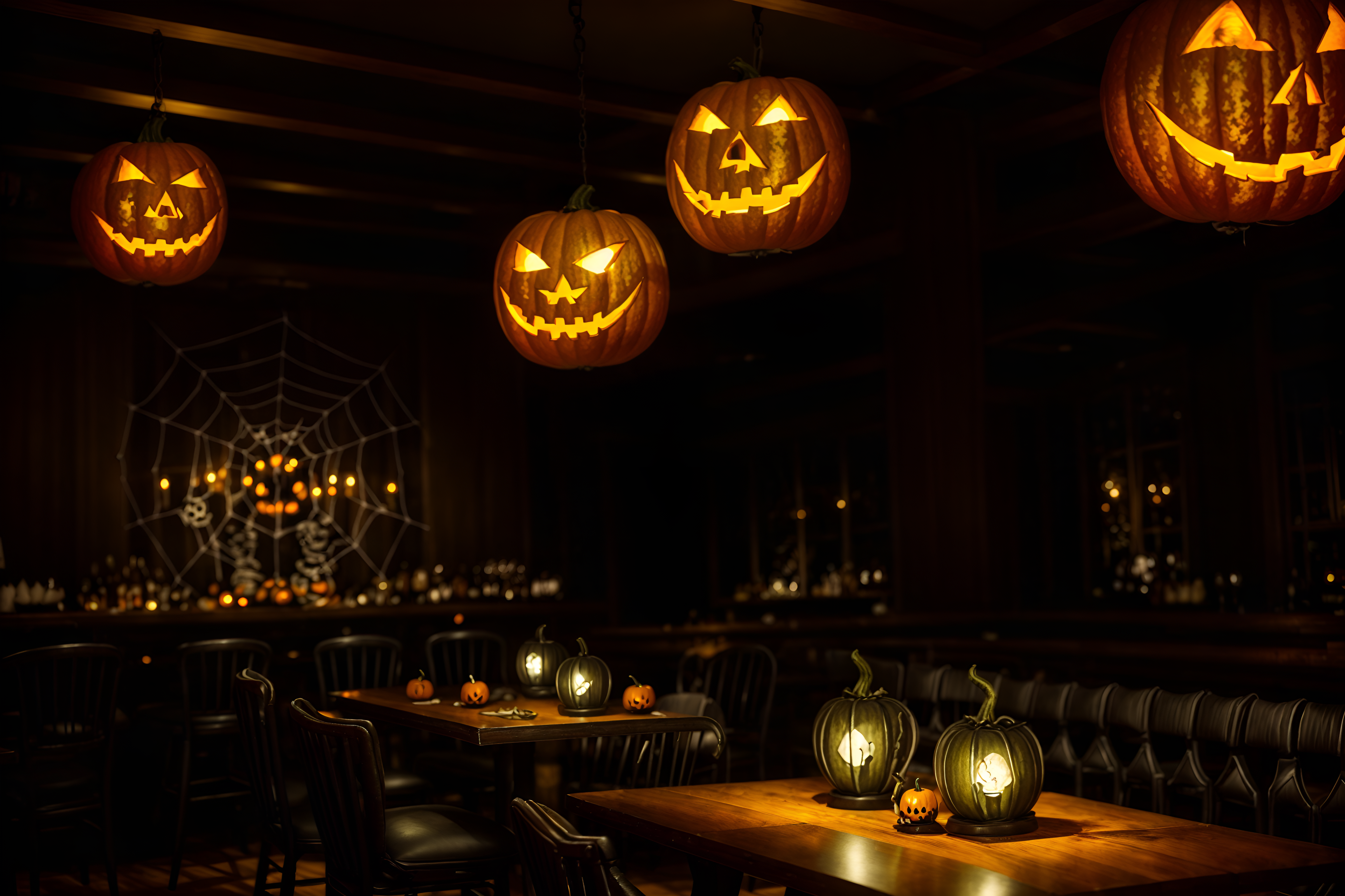photo from pinterest of halloween-style interior designed (restaurant interior) with restaurant chairs and restaurant bar and restaurant decor and restaurant dining tables and restaurant chairs. . with glowing pumpkins and skeletons sitting and standing and lanterns and human skulls and spiderwebs and lanterns and cobwebs and yellow black balloons. . cinematic photo, highly detailed, cinematic lighting, ultra-detailed, ultrarealistic, photorealism, 8k. trending on pinterest. halloween interior design style. masterpiece, cinematic light, ultrarealistic+, photorealistic+, 8k, raw photo, realistic, sharp focus on eyes, (symmetrical eyes), (intact eyes), hyperrealistic, highest quality, best quality, , highly detailed, masterpiece, best quality, extremely detailed 8k wallpaper, masterpiece, best quality, ultra-detailed, best shadow, detailed background, detailed face, detailed eyes, high contrast, best illumination, detailed face, dulux, caustic, dynamic angle, detailed glow. dramatic lighting. highly detailed, insanely detailed hair, symmetrical, intricate details, professionally retouched, 8k high definition. strong bokeh. award winning photo.