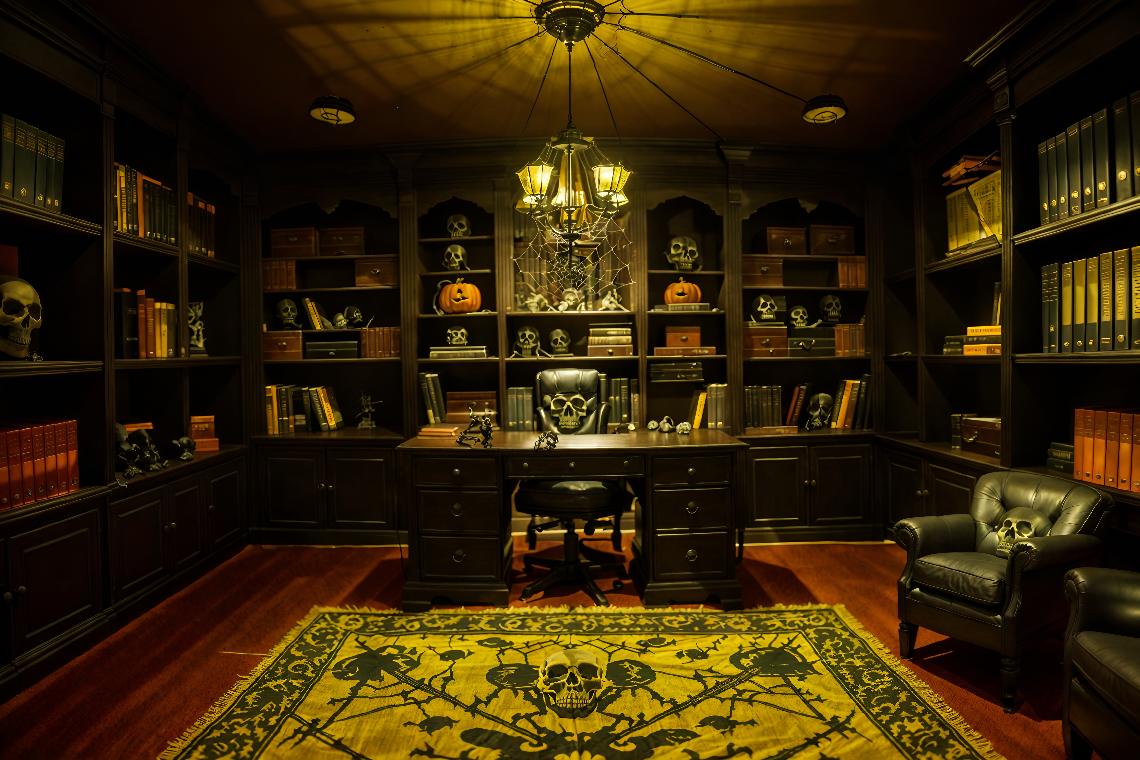 photo from pinterest of halloween-style interior designed (study room interior) with desk lamp and bookshelves and office chair and plant and cabinets and writing desk and lounge chair and desk lamp. . with cobwebs and human skulls and skeletons sitting and standing and spiderwebs and lanterns and lanterns and yellow black balloons and cobwebs. . cinematic photo, highly detailed, cinematic lighting, ultra-detailed, ultrarealistic, photorealism, 8k. trending on pinterest. halloween interior design style. masterpiece, cinematic light, ultrarealistic+, photorealistic+, 8k, raw photo, realistic, sharp focus on eyes, (symmetrical eyes), (intact eyes), hyperrealistic, highest quality, best quality, , highly detailed, masterpiece, best quality, extremely detailed 8k wallpaper, masterpiece, best quality, ultra-detailed, best shadow, detailed background, detailed face, detailed eyes, high contrast, best illumination, detailed face, dulux, caustic, dynamic angle, detailed glow. dramatic lighting. highly detailed, insanely detailed hair, symmetrical, intricate details, professionally retouched, 8k high definition. strong bokeh. award winning photo.