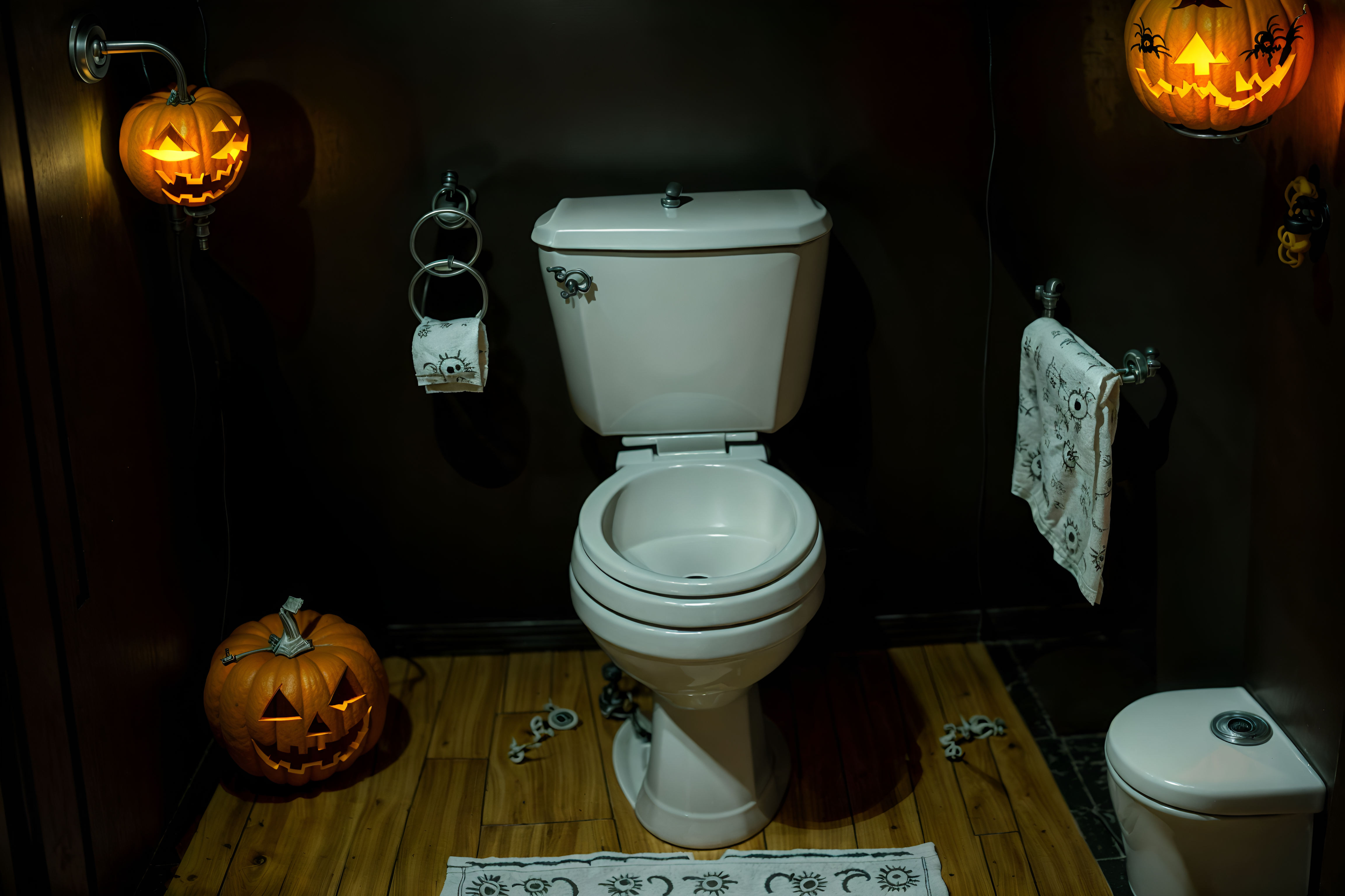 photo from pinterest of halloween-style interior designed (toilet interior) with sink with tap and toilet paper hanger and toilet with toilet seat up and sink with tap. . with yellow black balloons and lanterns and cobwebs and human skulls and lanterns and cobwebs and glowing pumpkins and spiderwebs. . cinematic photo, highly detailed, cinematic lighting, ultra-detailed, ultrarealistic, photorealism, 8k. trending on pinterest. halloween interior design style. masterpiece, cinematic light, ultrarealistic+, photorealistic+, 8k, raw photo, realistic, sharp focus on eyes, (symmetrical eyes), (intact eyes), hyperrealistic, highest quality, best quality, , highly detailed, masterpiece, best quality, extremely detailed 8k wallpaper, masterpiece, best quality, ultra-detailed, best shadow, detailed background, detailed face, detailed eyes, high contrast, best illumination, detailed face, dulux, caustic, dynamic angle, detailed glow. dramatic lighting. highly detailed, insanely detailed hair, symmetrical, intricate details, professionally retouched, 8k high definition. strong bokeh. award winning photo.