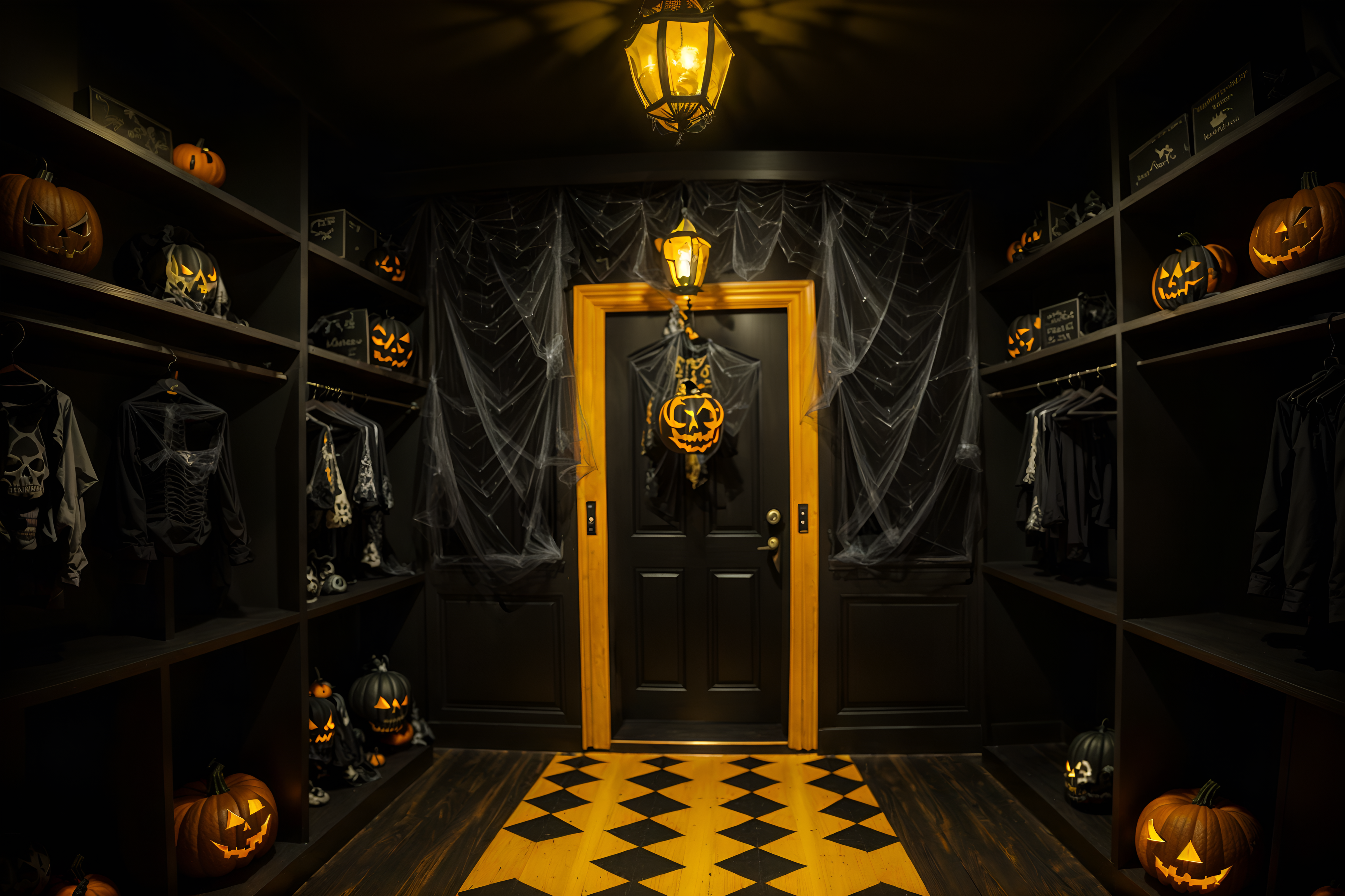 photo from pinterest of halloween-style interior designed (walk in closet interior) . with yellow black balloons and lanterns and glowing pumpkins and spiderwebs and lanterns and cobwebs and cobwebs and human skulls. . cinematic photo, highly detailed, cinematic lighting, ultra-detailed, ultrarealistic, photorealism, 8k. trending on pinterest. halloween interior design style. masterpiece, cinematic light, ultrarealistic+, photorealistic+, 8k, raw photo, realistic, sharp focus on eyes, (symmetrical eyes), (intact eyes), hyperrealistic, highest quality, best quality, , highly detailed, masterpiece, best quality, extremely detailed 8k wallpaper, masterpiece, best quality, ultra-detailed, best shadow, detailed background, detailed face, detailed eyes, high contrast, best illumination, detailed face, dulux, caustic, dynamic angle, detailed glow. dramatic lighting. highly detailed, insanely detailed hair, symmetrical, intricate details, professionally retouched, 8k high definition. strong bokeh. award winning photo.