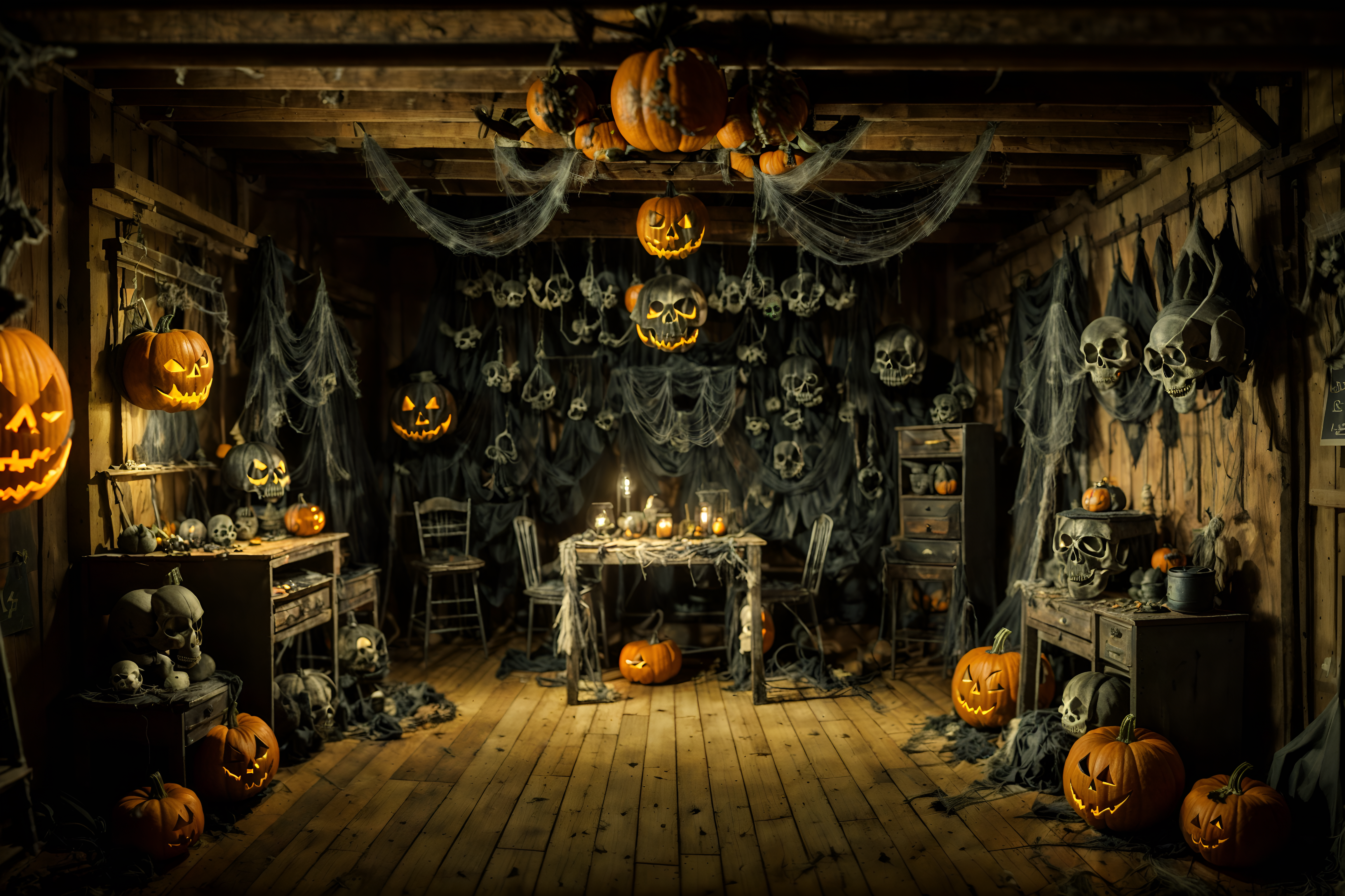 photo from pinterest of halloween-style interior designed (workshop interior) with messy and tool wall and wooden workbench and messy. . with glowing pumpkins and cobwebs and cobwebs and spiderwebs and lanterns and yellow black balloons and skeletons sitting and standing and human skulls. . cinematic photo, highly detailed, cinematic lighting, ultra-detailed, ultrarealistic, photorealism, 8k. trending on pinterest. halloween interior design style. masterpiece, cinematic light, ultrarealistic+, photorealistic+, 8k, raw photo, realistic, sharp focus on eyes, (symmetrical eyes), (intact eyes), hyperrealistic, highest quality, best quality, , highly detailed, masterpiece, best quality, extremely detailed 8k wallpaper, masterpiece, best quality, ultra-detailed, best shadow, detailed background, detailed face, detailed eyes, high contrast, best illumination, detailed face, dulux, caustic, dynamic angle, detailed glow. dramatic lighting. highly detailed, insanely detailed hair, symmetrical, intricate details, professionally retouched, 8k high definition. strong bokeh. award winning photo.