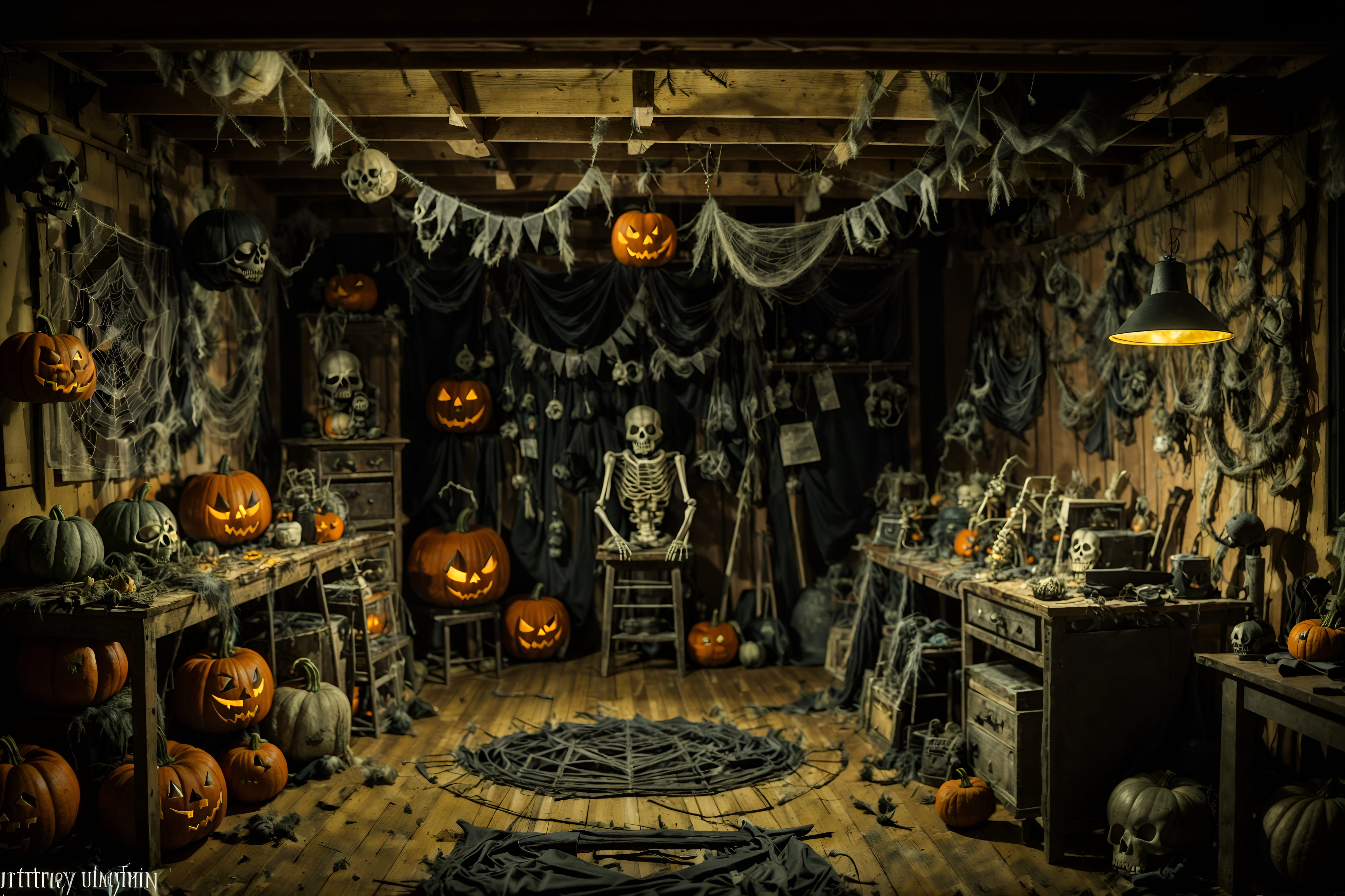 photo from pinterest of halloween-style interior designed (workshop interior) with messy and tool wall and wooden workbench and messy. . with glowing pumpkins and cobwebs and cobwebs and spiderwebs and lanterns and yellow black balloons and skeletons sitting and standing and human skulls. . cinematic photo, highly detailed, cinematic lighting, ultra-detailed, ultrarealistic, photorealism, 8k. trending on pinterest. halloween interior design style. masterpiece, cinematic light, ultrarealistic+, photorealistic+, 8k, raw photo, realistic, sharp focus on eyes, (symmetrical eyes), (intact eyes), hyperrealistic, highest quality, best quality, , highly detailed, masterpiece, best quality, extremely detailed 8k wallpaper, masterpiece, best quality, ultra-detailed, best shadow, detailed background, detailed face, detailed eyes, high contrast, best illumination, detailed face, dulux, caustic, dynamic angle, detailed glow. dramatic lighting. highly detailed, insanely detailed hair, symmetrical, intricate details, professionally retouched, 8k high definition. strong bokeh. award winning photo.