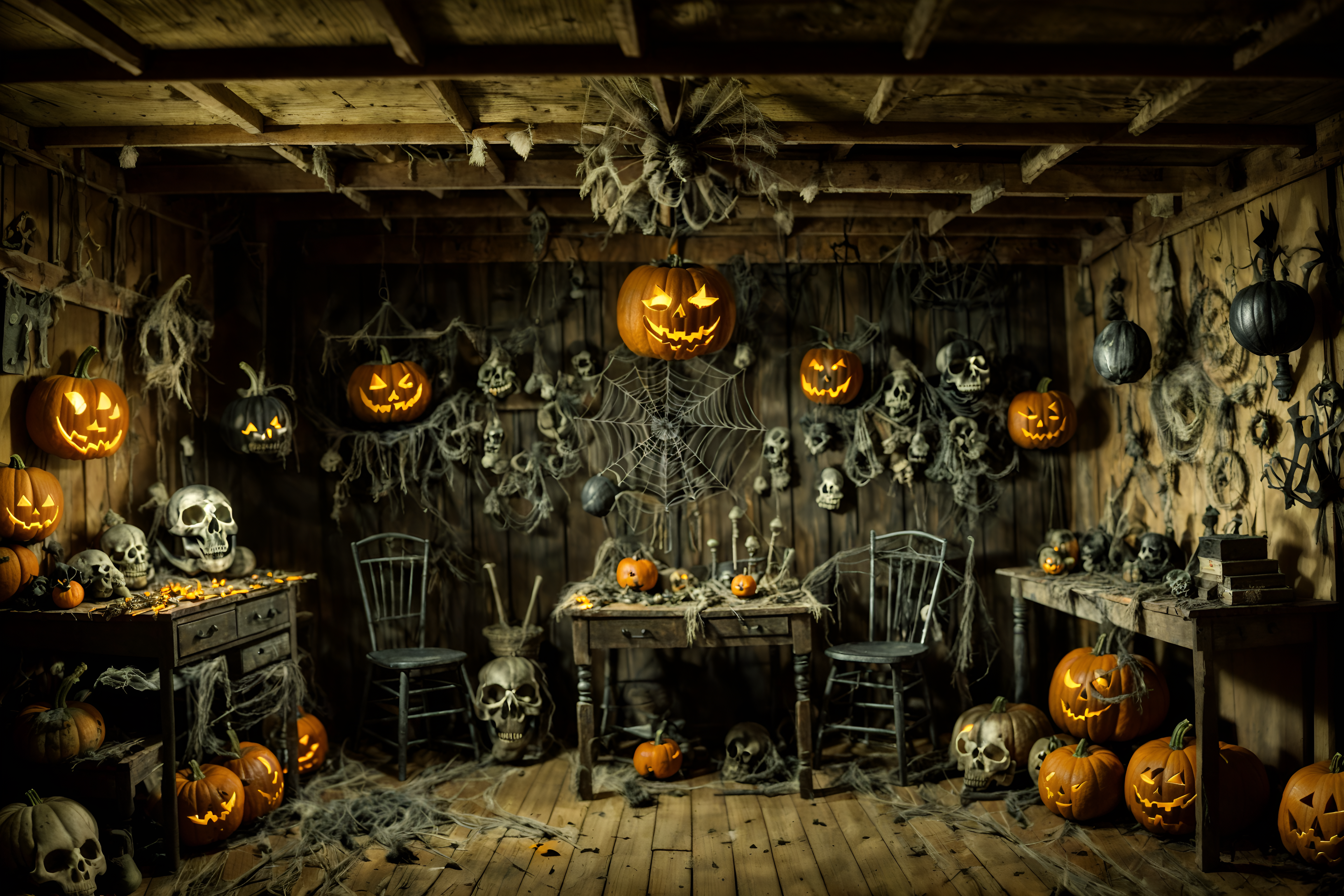photo from pinterest of halloween-style interior designed (workshop interior) with messy and tool wall and wooden workbench and messy. . with glowing pumpkins and cobwebs and cobwebs and spiderwebs and lanterns and yellow black balloons and skeletons sitting and standing and human skulls. . cinematic photo, highly detailed, cinematic lighting, ultra-detailed, ultrarealistic, photorealism, 8k. trending on pinterest. halloween interior design style. masterpiece, cinematic light, ultrarealistic+, photorealistic+, 8k, raw photo, realistic, sharp focus on eyes, (symmetrical eyes), (intact eyes), hyperrealistic, highest quality, best quality, , highly detailed, masterpiece, best quality, extremely detailed 8k wallpaper, masterpiece, best quality, ultra-detailed, best shadow, detailed background, detailed face, detailed eyes, high contrast, best illumination, detailed face, dulux, caustic, dynamic angle, detailed glow. dramatic lighting. highly detailed, insanely detailed hair, symmetrical, intricate details, professionally retouched, 8k high definition. strong bokeh. award winning photo.