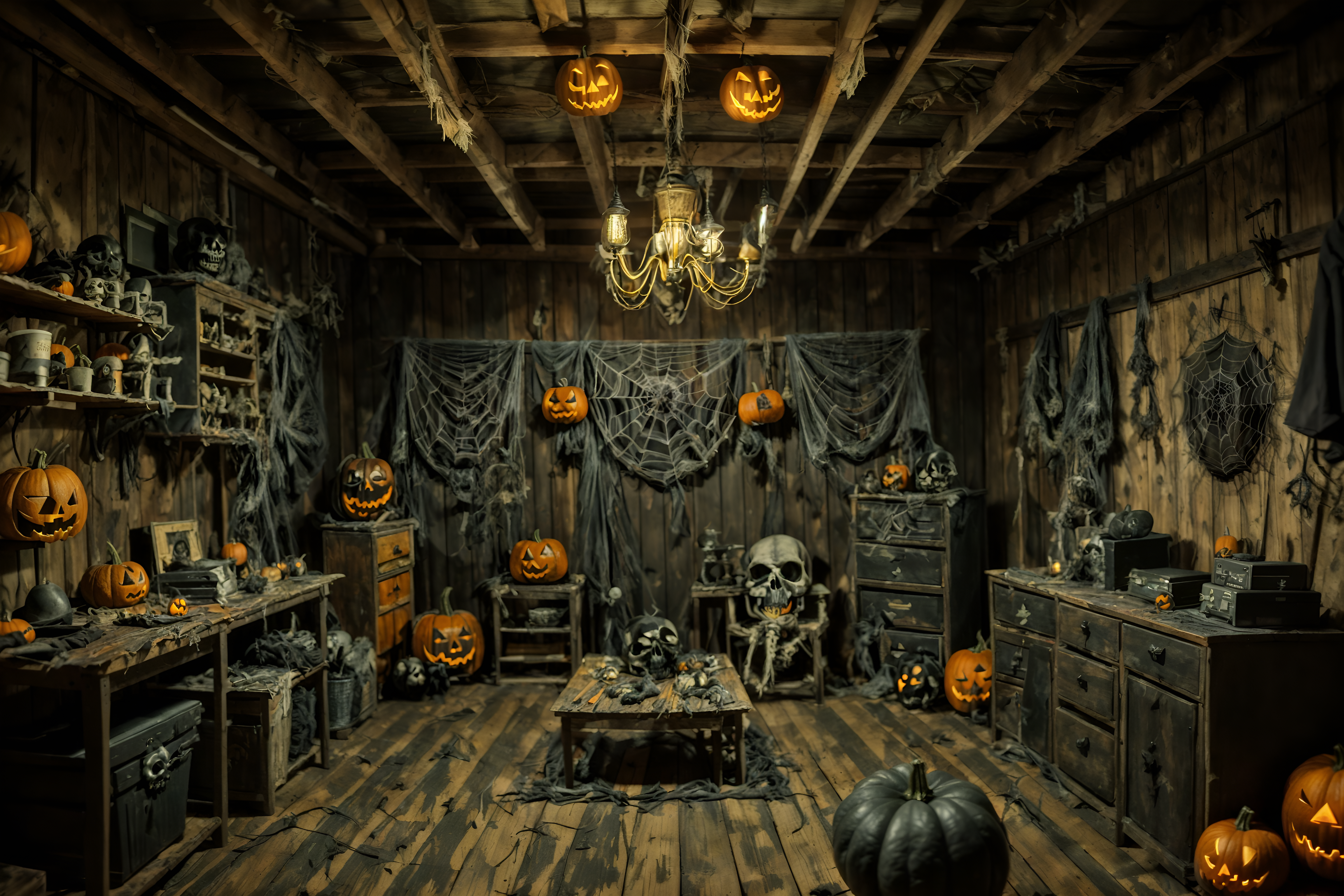 photo from pinterest of halloween-style interior designed (workshop interior) with messy and tool wall and wooden workbench and messy. . with glowing pumpkins and cobwebs and cobwebs and spiderwebs and lanterns and yellow black balloons and skeletons sitting and standing and human skulls. . cinematic photo, highly detailed, cinematic lighting, ultra-detailed, ultrarealistic, photorealism, 8k. trending on pinterest. halloween interior design style. masterpiece, cinematic light, ultrarealistic+, photorealistic+, 8k, raw photo, realistic, sharp focus on eyes, (symmetrical eyes), (intact eyes), hyperrealistic, highest quality, best quality, , highly detailed, masterpiece, best quality, extremely detailed 8k wallpaper, masterpiece, best quality, ultra-detailed, best shadow, detailed background, detailed face, detailed eyes, high contrast, best illumination, detailed face, dulux, caustic, dynamic angle, detailed glow. dramatic lighting. highly detailed, insanely detailed hair, symmetrical, intricate details, professionally retouched, 8k high definition. strong bokeh. award winning photo.