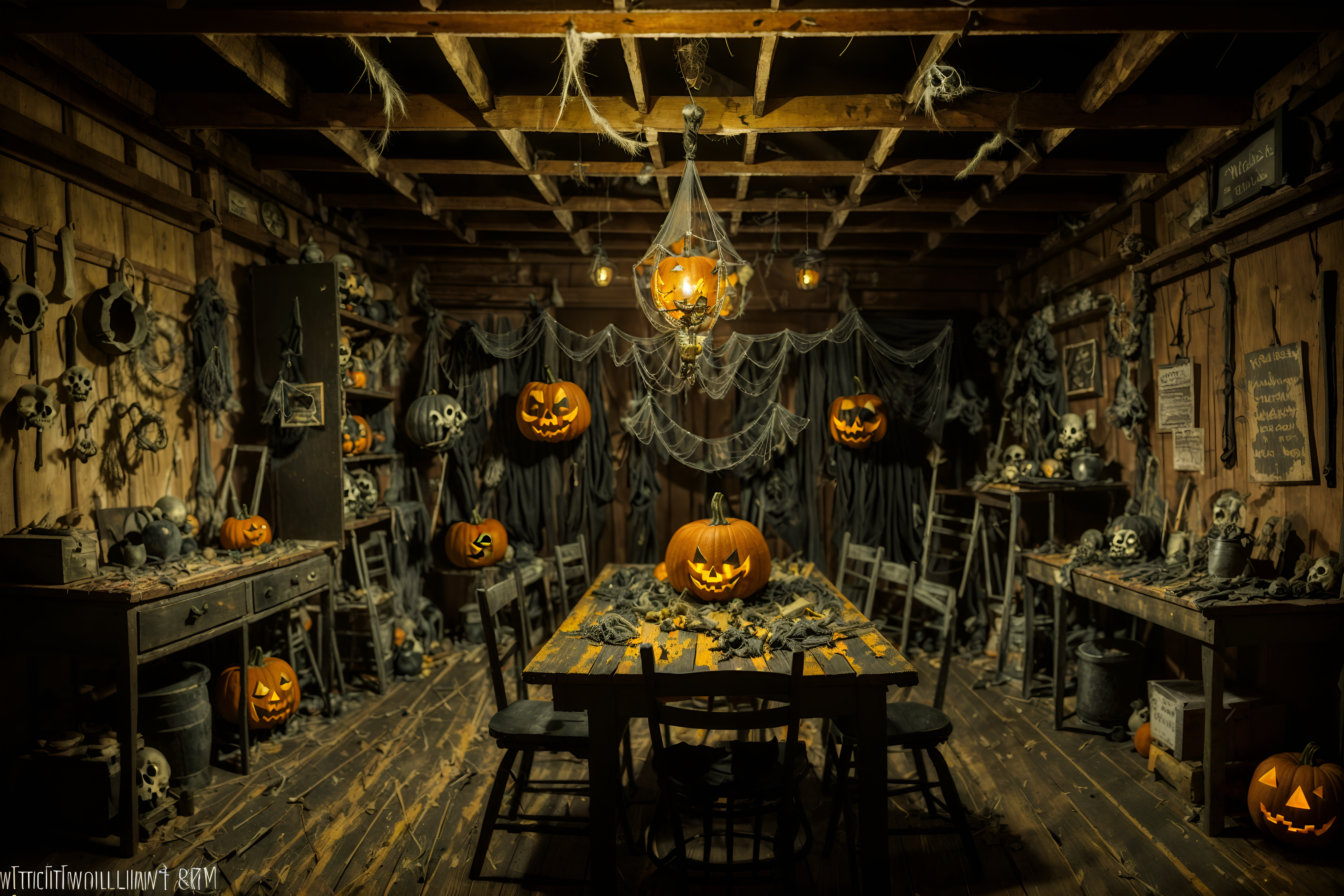photo from pinterest of halloween-style interior designed (workshop interior) with messy and tool wall and wooden workbench and messy. . with glowing pumpkins and cobwebs and cobwebs and spiderwebs and lanterns and yellow black balloons and skeletons sitting and standing and human skulls. . cinematic photo, highly detailed, cinematic lighting, ultra-detailed, ultrarealistic, photorealism, 8k. trending on pinterest. halloween interior design style. masterpiece, cinematic light, ultrarealistic+, photorealistic+, 8k, raw photo, realistic, sharp focus on eyes, (symmetrical eyes), (intact eyes), hyperrealistic, highest quality, best quality, , highly detailed, masterpiece, best quality, extremely detailed 8k wallpaper, masterpiece, best quality, ultra-detailed, best shadow, detailed background, detailed face, detailed eyes, high contrast, best illumination, detailed face, dulux, caustic, dynamic angle, detailed glow. dramatic lighting. highly detailed, insanely detailed hair, symmetrical, intricate details, professionally retouched, 8k high definition. strong bokeh. award winning photo.