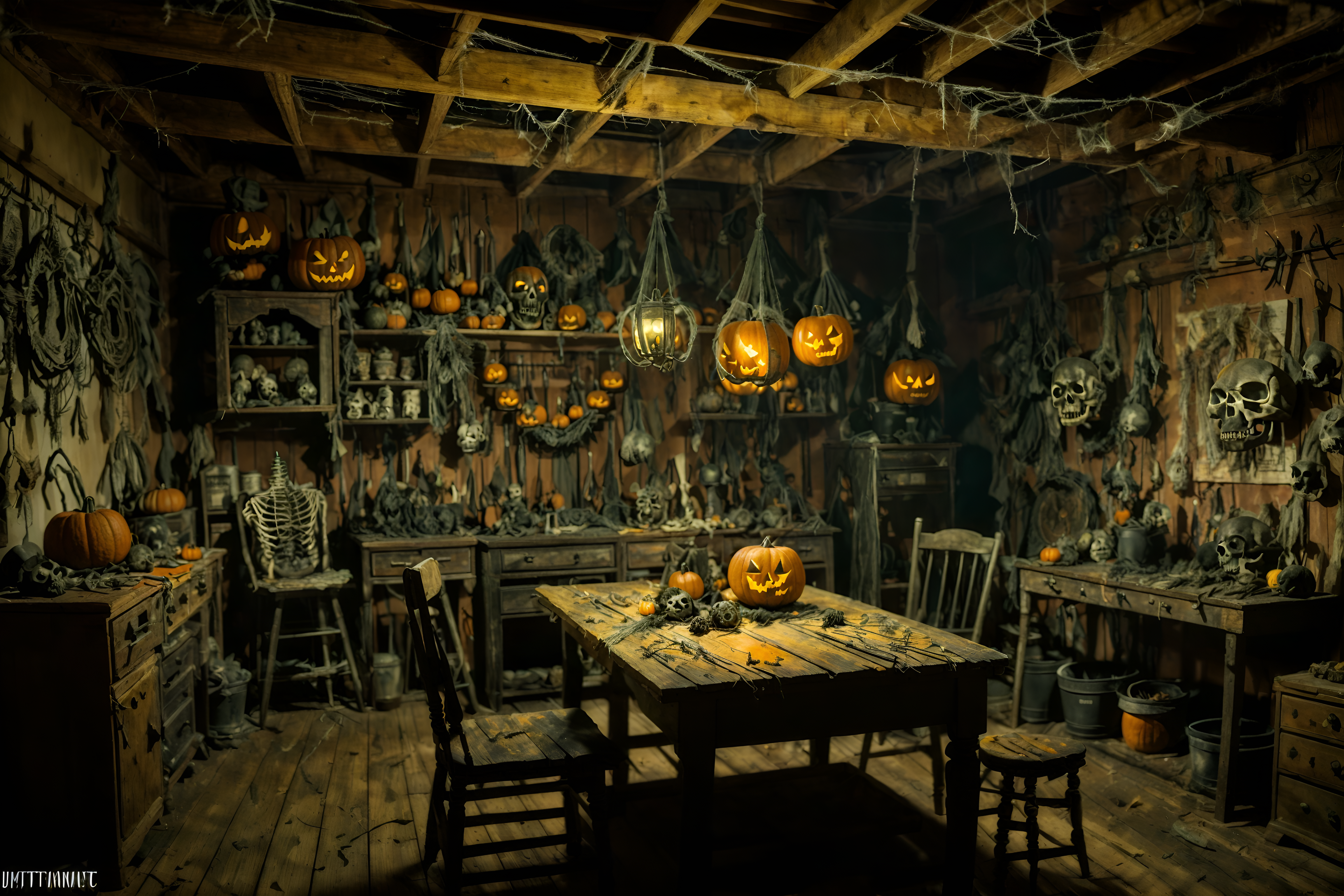 photo from pinterest of halloween-style interior designed (workshop interior) with messy and tool wall and wooden workbench and messy. . with glowing pumpkins and cobwebs and cobwebs and spiderwebs and lanterns and yellow black balloons and skeletons sitting and standing and human skulls. . cinematic photo, highly detailed, cinematic lighting, ultra-detailed, ultrarealistic, photorealism, 8k. trending on pinterest. halloween interior design style. masterpiece, cinematic light, ultrarealistic+, photorealistic+, 8k, raw photo, realistic, sharp focus on eyes, (symmetrical eyes), (intact eyes), hyperrealistic, highest quality, best quality, , highly detailed, masterpiece, best quality, extremely detailed 8k wallpaper, masterpiece, best quality, ultra-detailed, best shadow, detailed background, detailed face, detailed eyes, high contrast, best illumination, detailed face, dulux, caustic, dynamic angle, detailed glow. dramatic lighting. highly detailed, insanely detailed hair, symmetrical, intricate details, professionally retouched, 8k high definition. strong bokeh. award winning photo.