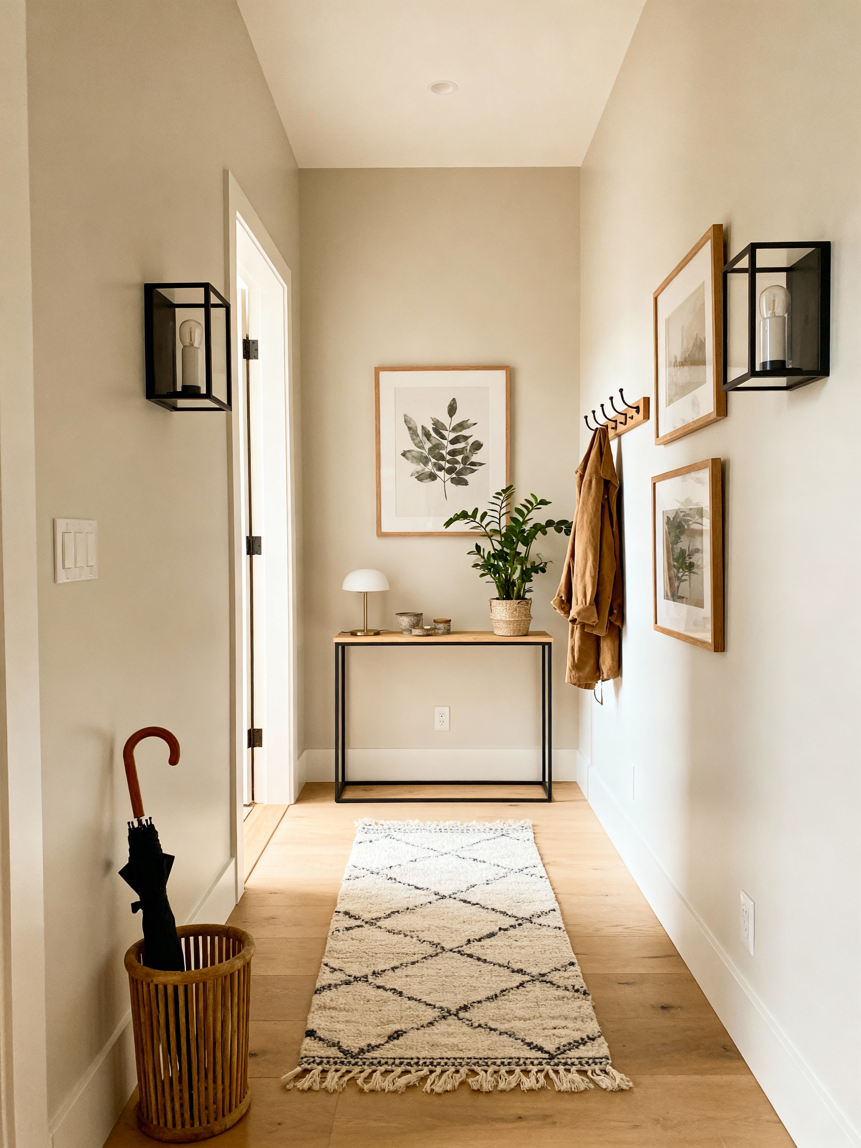 hallway with airbnb style with umbrella stand and runner rug and wall art and plant and coat rack and picture frames and console table and wall sconces. . with practicality and functionality and scandinavian style and natural materials and elements and simple color palette and open and natural lighting and neutral walls and textures and simple, clean lines and simplistic furniture and practicality and functionality