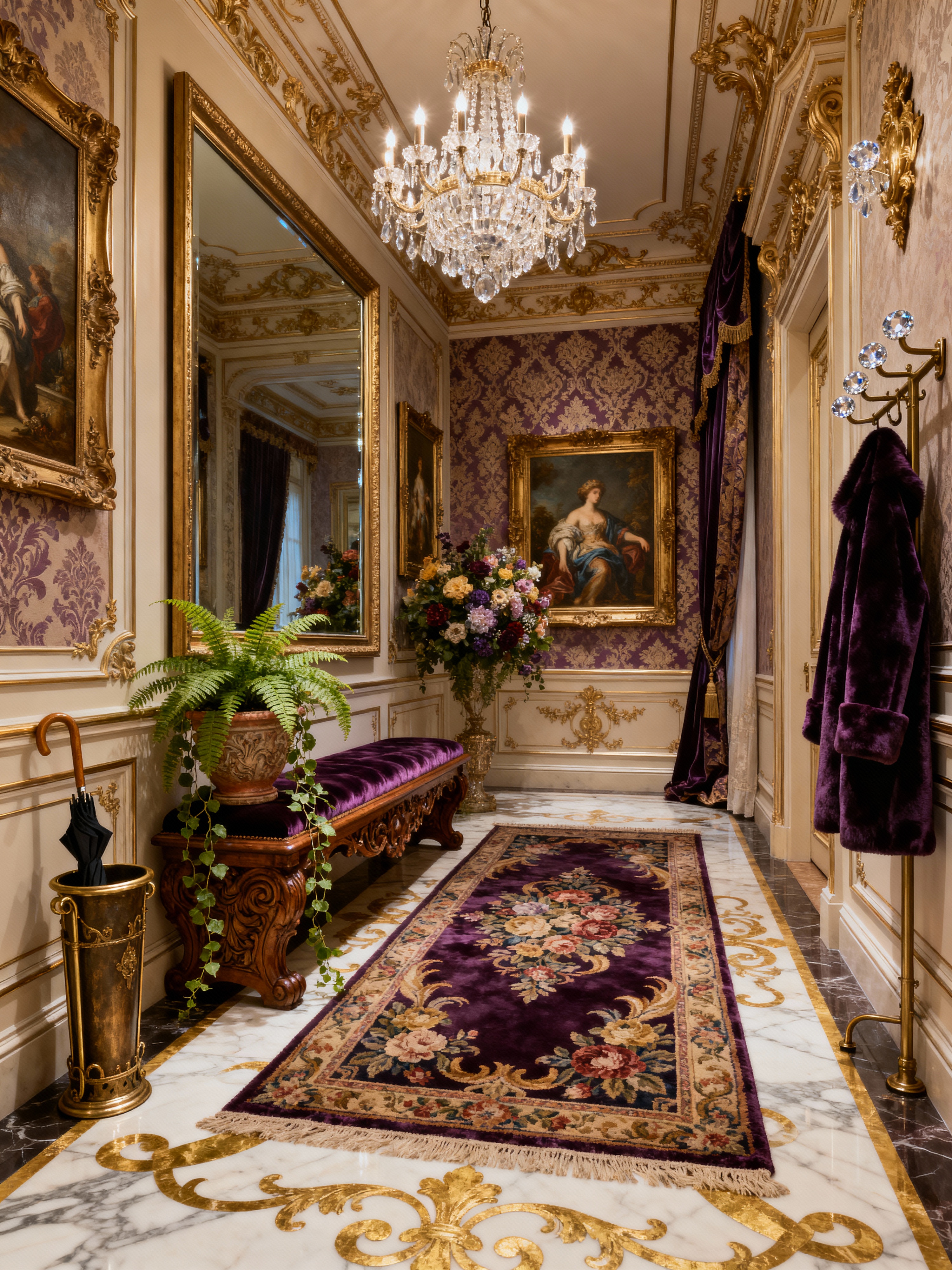 hallway with baroque style with mirror and plant and umbrella stand and bench and runner rug and wall art and coat rack and picture frames. . with crystal and glass accents and emotional exuberance and expensive and plush flooring and elaborate ornamentation and sensuous richness and luxurious floral and damask fabrics and tension and movement