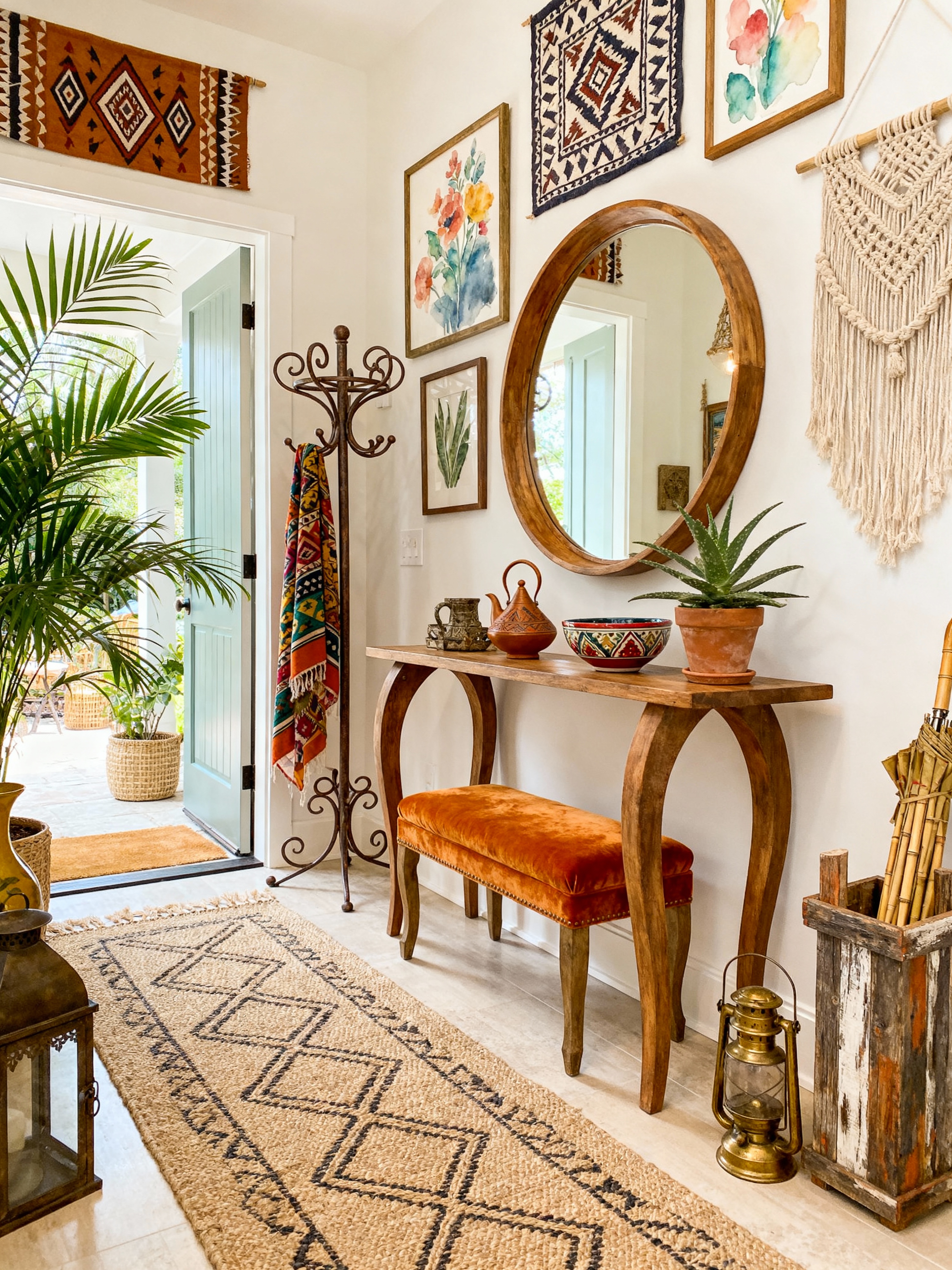 hallway with boho-chic style with wall art and bench and console table and coat rack and runner rug and umbrella stand and mirror and plant. . with global artifacts and bohemian flair and mixed patterns and vintage finds and eclectic mix and artistic touches and free-spirited and natural materials