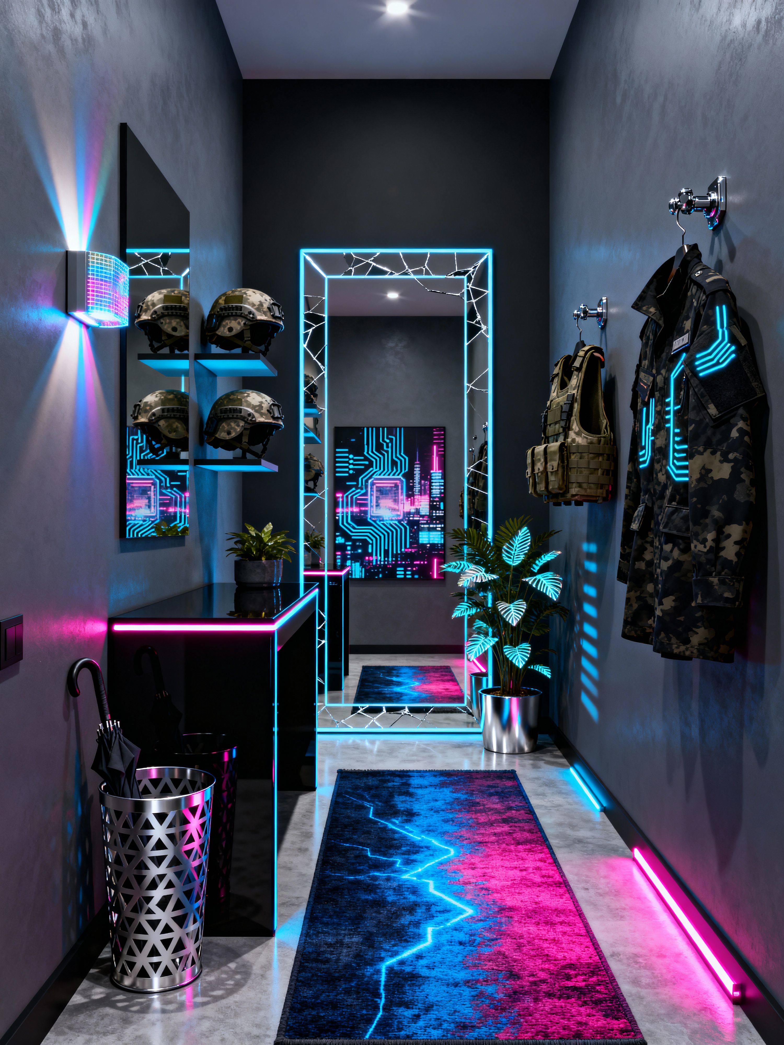 hallway with cyberpunk style with umbrella stand and console table and picture frames and wall art and runner rug and plant and wall sconces and mirror. . with cyberpunk lights and military uniforms and gear and color lights glow and cyberpunk style and bladerunner style and led lights and synthwave and minimalist