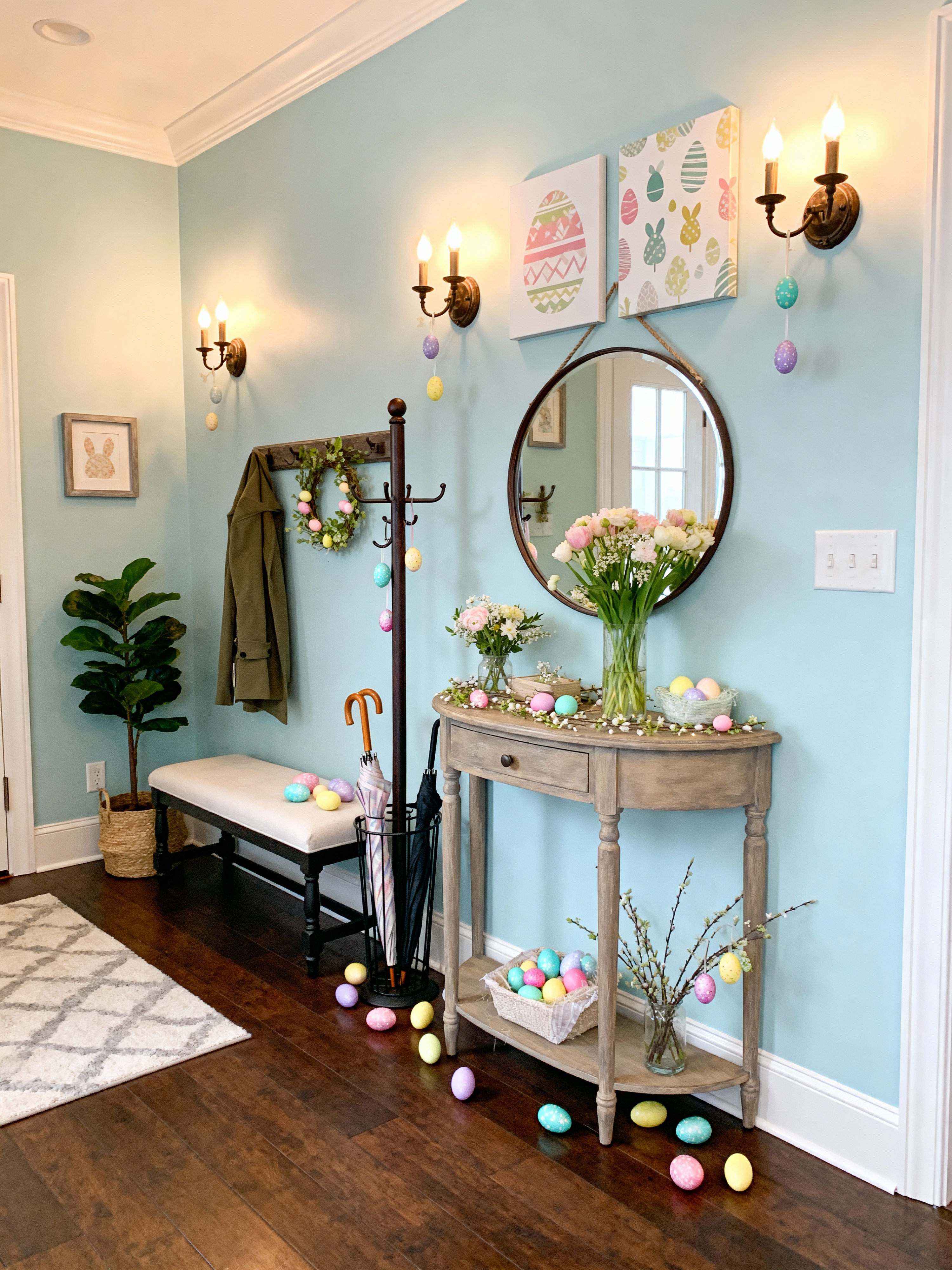 hallway with easter style with wall sconces and umbrella stand and bench and coat rack and plant and mirror and console table and wall art. . with flowers on table and spring decorations and colorful easter eggs and light blue colors and easter decorations and flowers on table