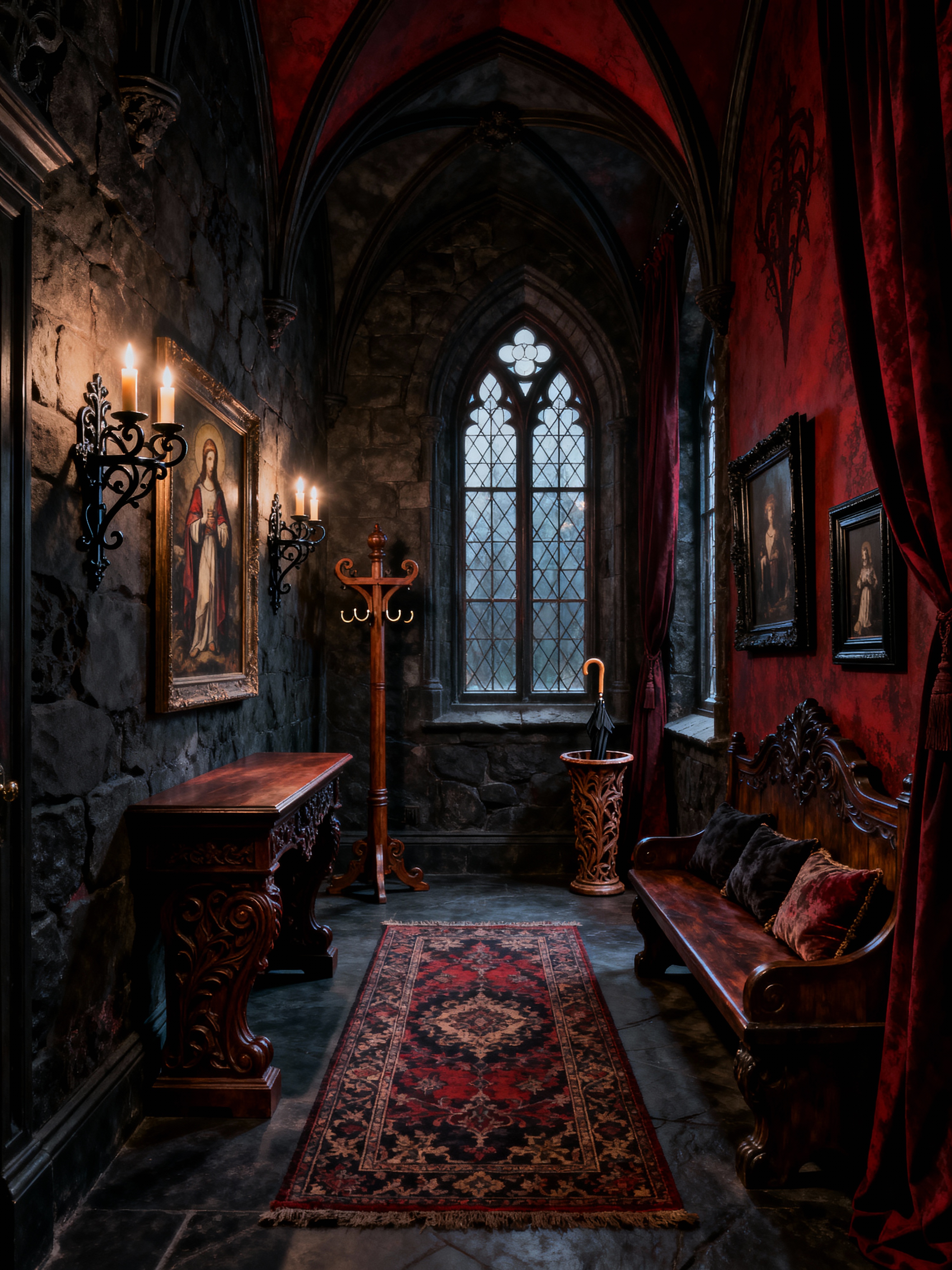 hallway with gothic style with console table and wall sconces and wall art and coat rack and runner rug and umbrella stand and bench and picture frames. . with mysterious mood and arched windows and rich fabrics and cathedral style and heavy furniture and stone textures and dark colors and dramatic atmosphere