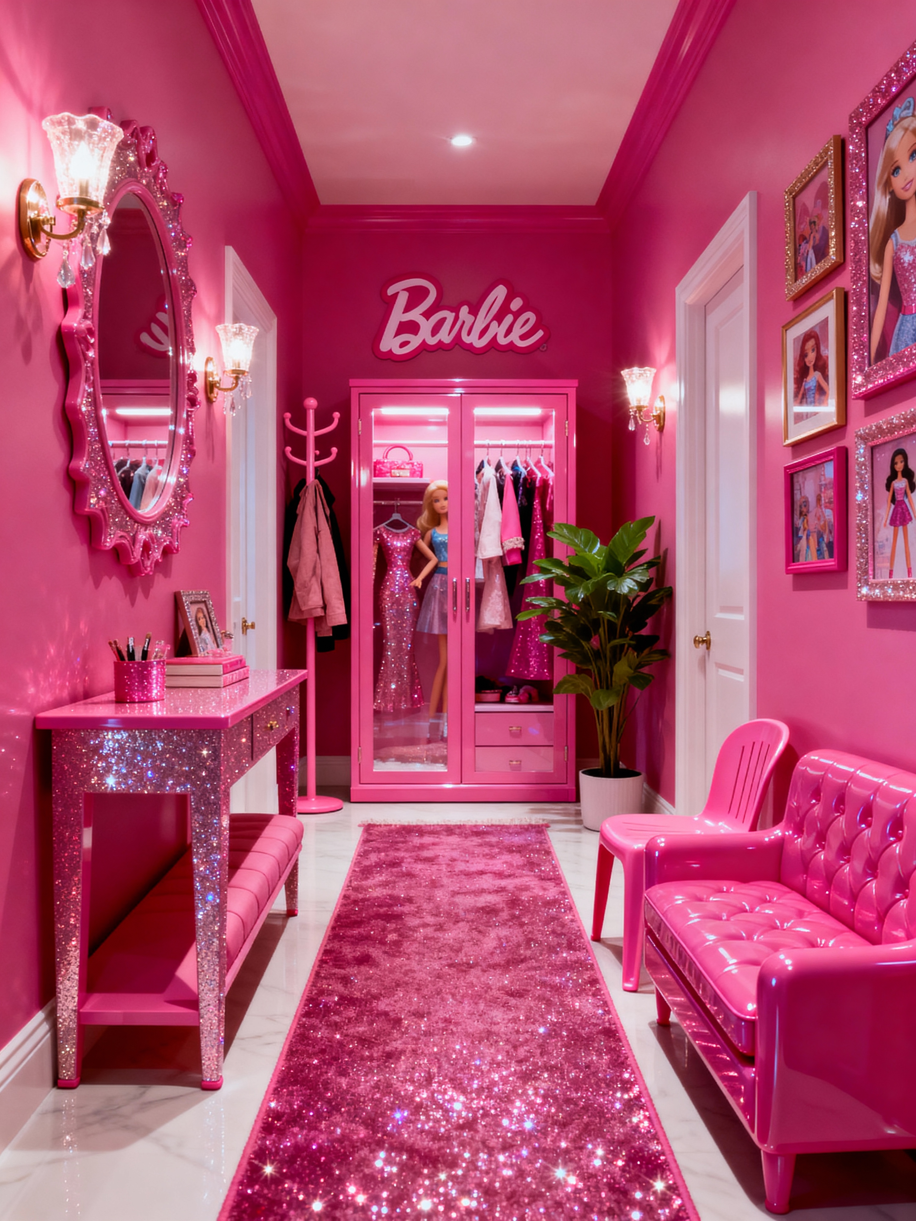 hallway with hot pink style with console table and bench and wall art and coat rack and plant and runner rug and wall sconces and picture frames. . with barbie plastic interior and barbie bold rosy hues like fuchsia and magenta and barbie closet and barbie chairs and hot pink barbie walls and hot pink barbie colors and barbie sofa and barbie glitter and sparkle