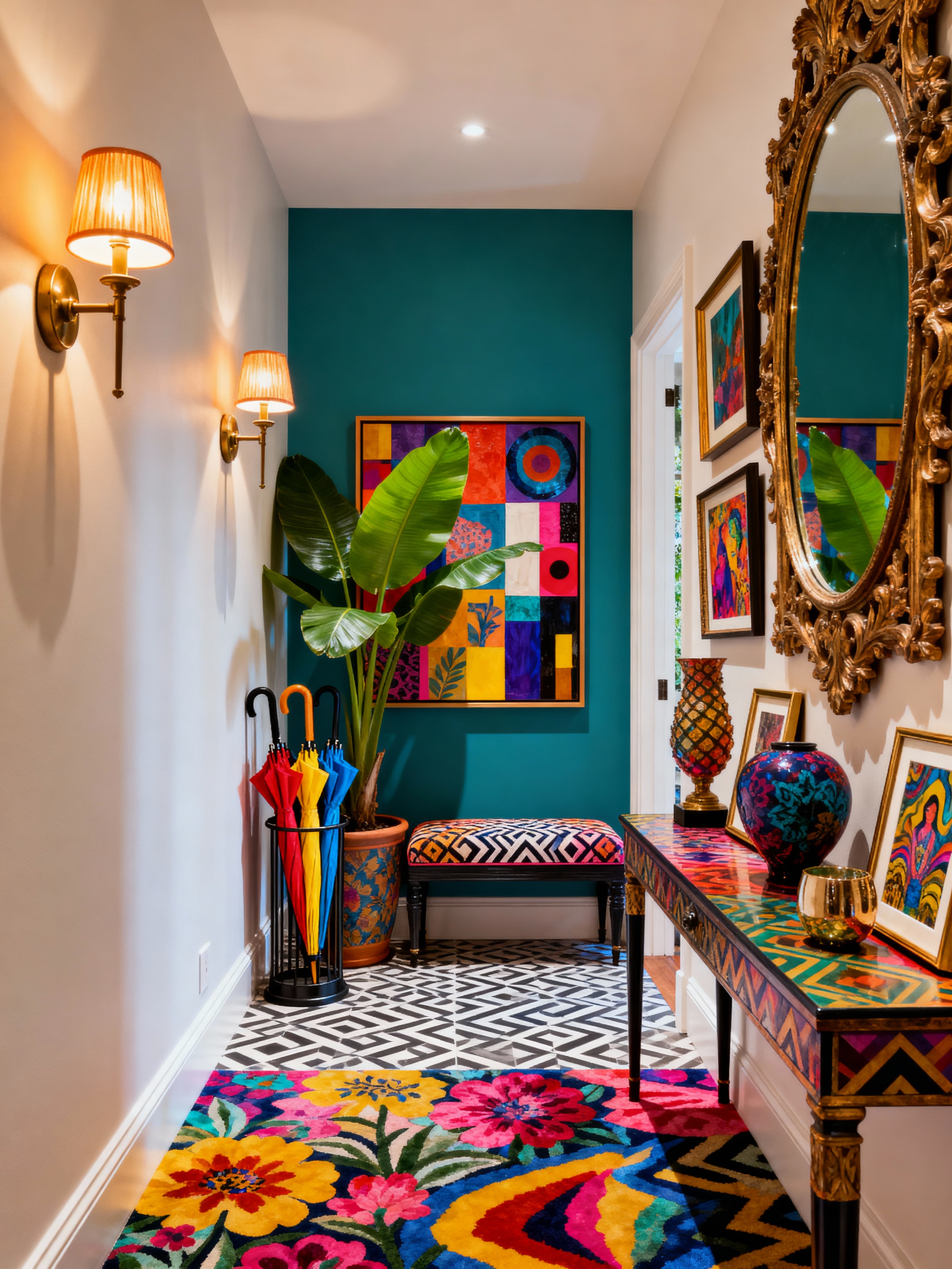 hallway with maximalist style with wall sconces and umbrella stand and wall art and plant and bench and mirror and picture frames and console table. . with bold creativity and vibrant and over-the-top aesthetic and bold design and bold patterns and playful and more is more philosophy and eye-catching