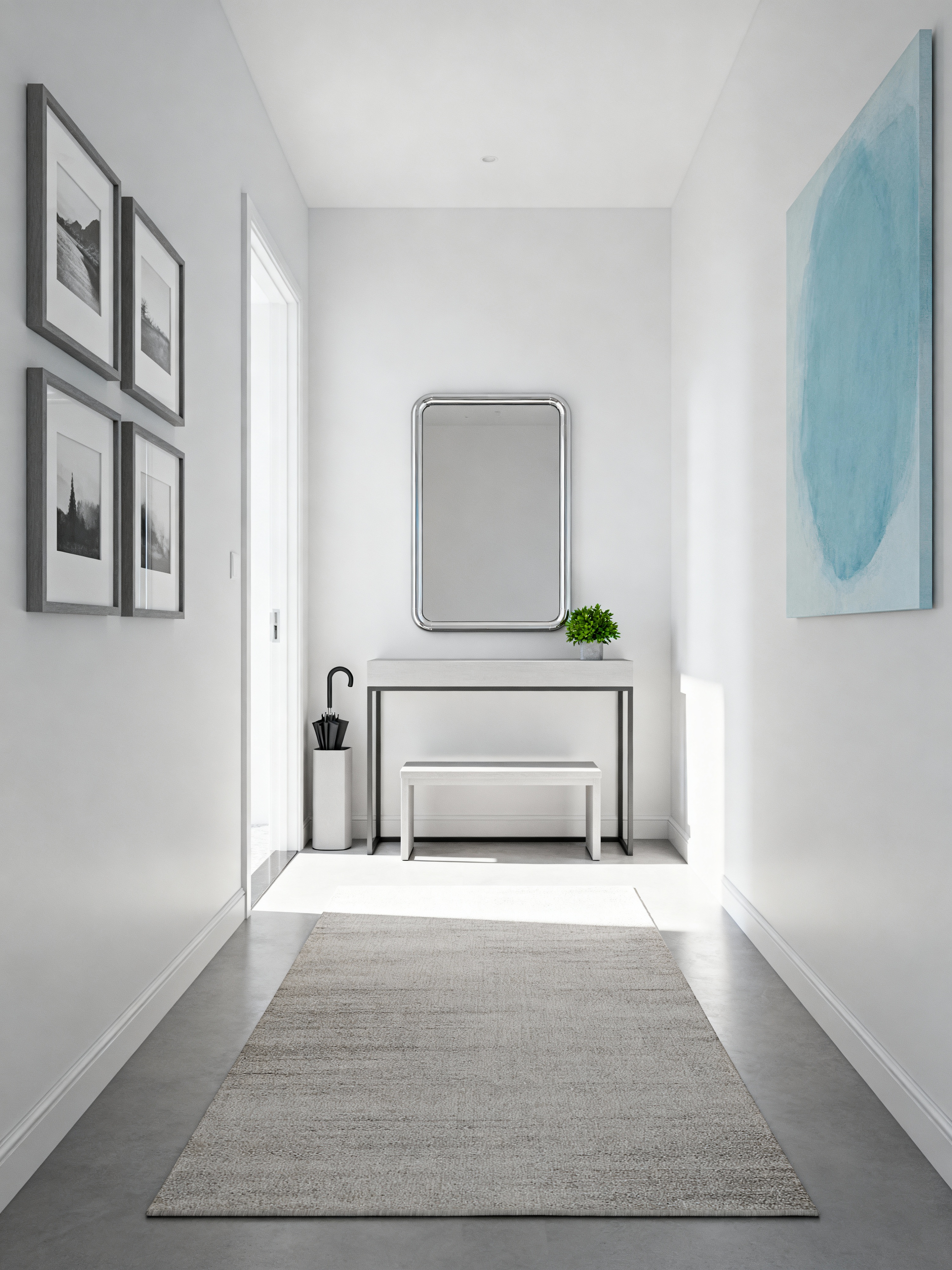 hallway with minimalist style with mirror and picture frames and bench and wall art and runner rug and umbrella stand and console table and plant. . with functional furniture and clean lines and focus on the shape, colour and texture of just a few of essential elements and a monochromatic palette with colour used as an accent and lots of light and an open floor plan and functional furniture