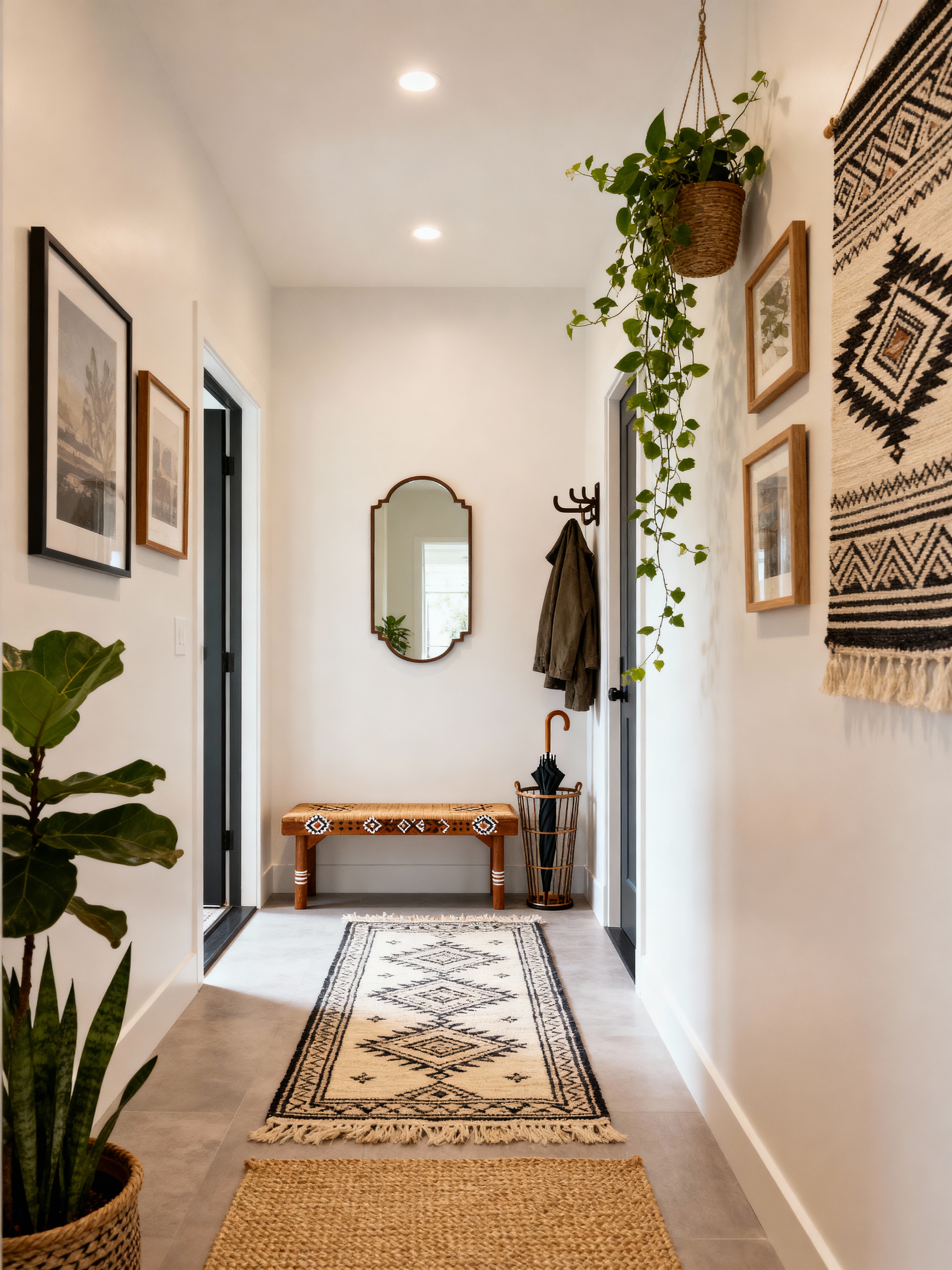 hallway with modern boho style with mirror and picture frames and plant and bench and umbrella stand and coat rack and wall art and runner rug. . with patterns and comfortable and minimalist and earthy tones and jute rugs and handcrafted items and greenery and plants
