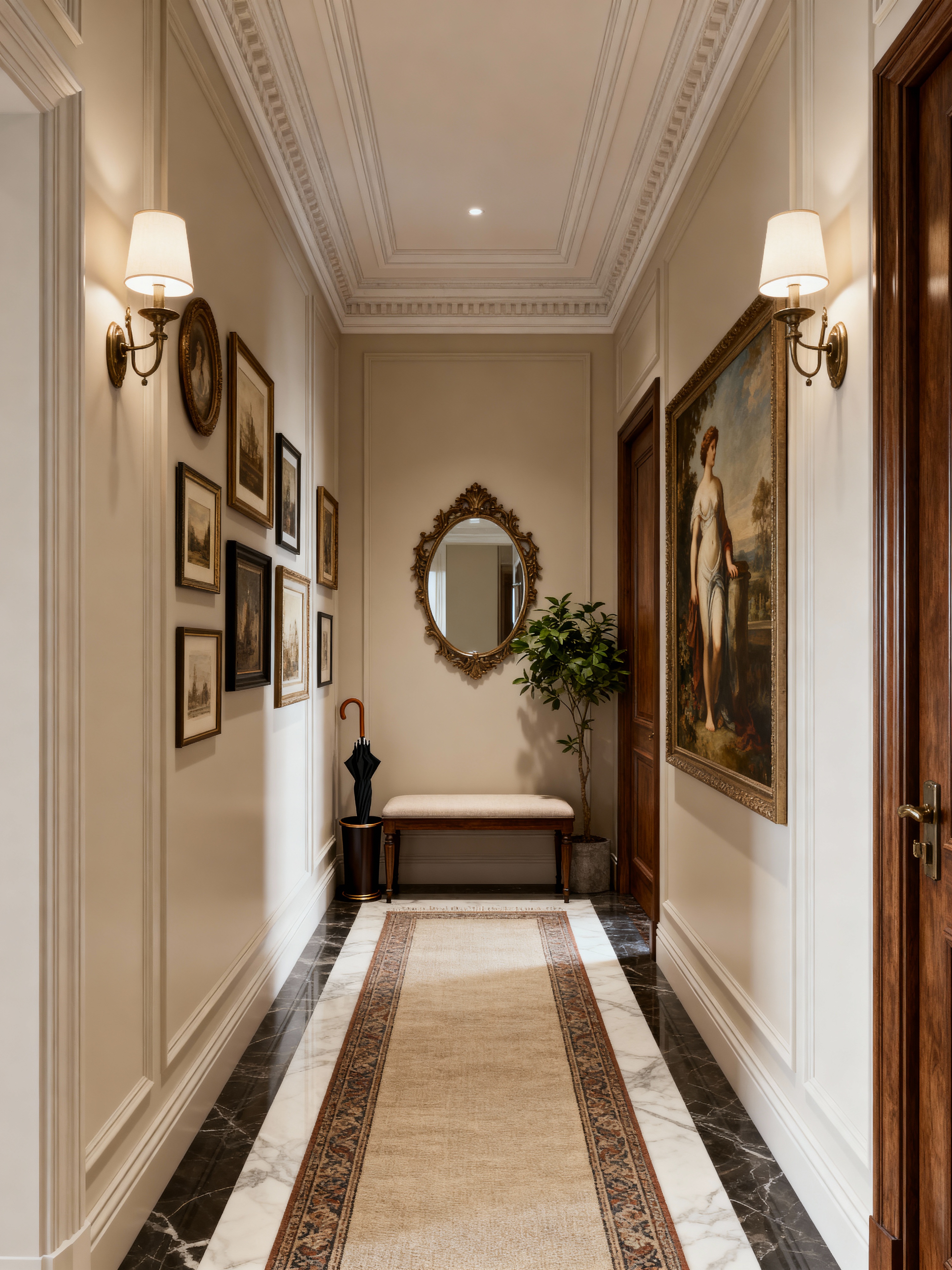 hallway with neoclassic style with wall sconces and umbrella stand and picture frames and bench and mirror and wall art and runner rug and plant. . with elegant and sophisticated and emphasized horizontal and vertical lines and symmetric layouts and timeless furniture and spacious rooms and timeless artwork and high ceilings and classical architectural details