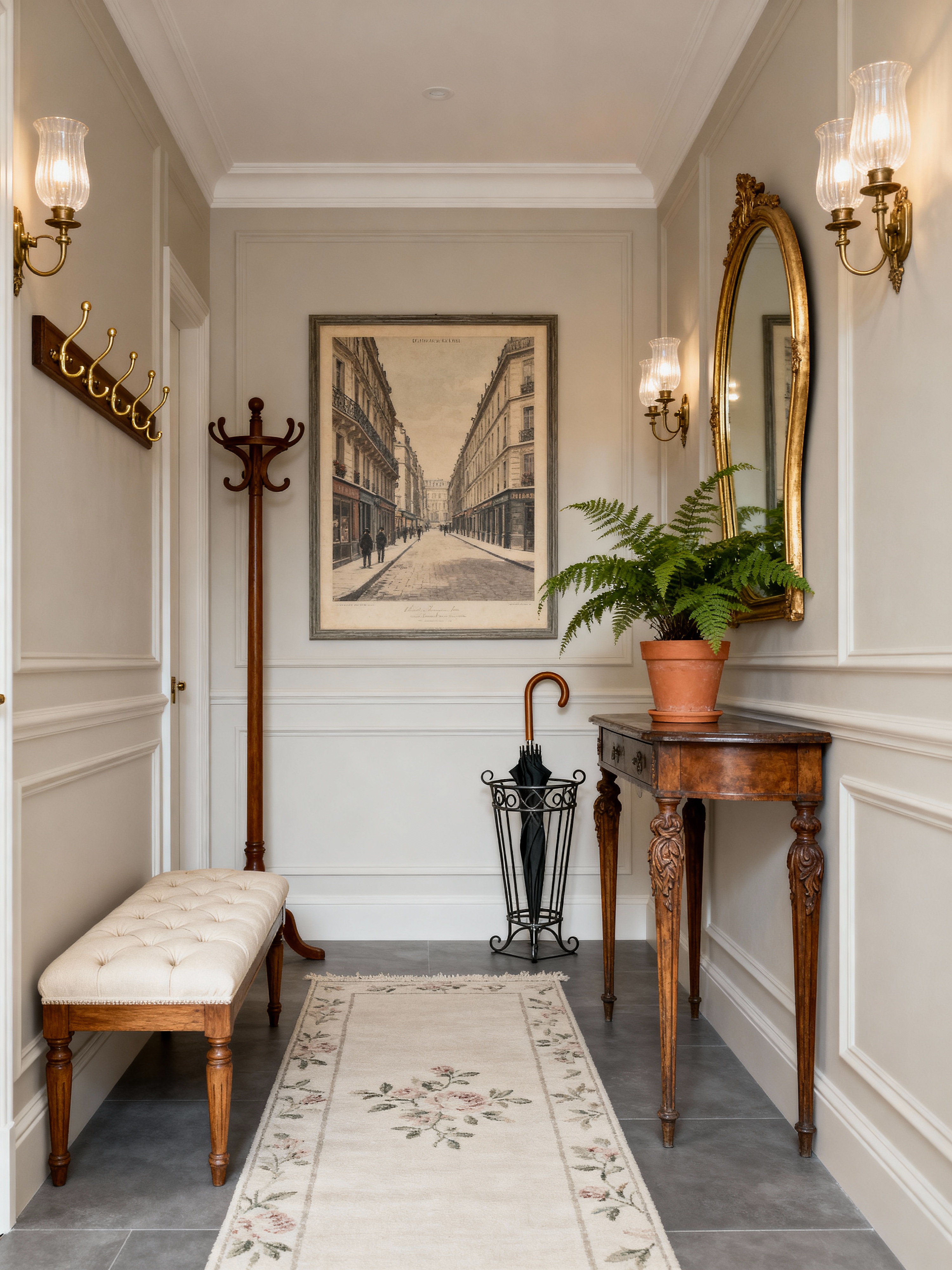 hallway with parisian style with bench and umbrella stand and coat rack and wall sconces and runner rug and wall art and plant and mirror. . with chic simplicity and european flair and neutral palette and classic details and vintage pieces and refined style and sophisticated charm and antique furniture