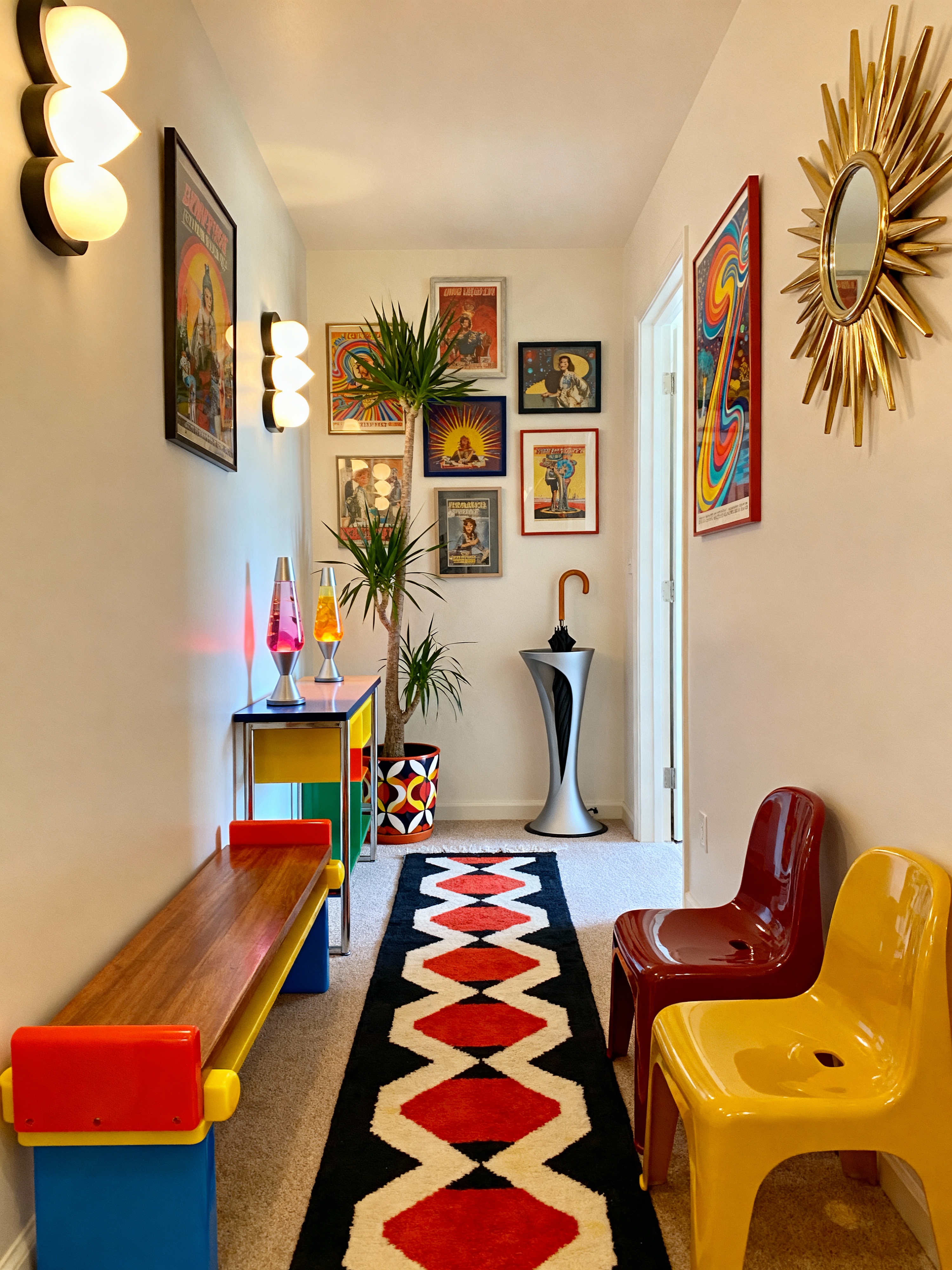 hallway with retro style with picture frames and bench and wall art and umbrella stand and plant and wall sconces and runner rug and console table. . with space age and nostalgic pieces and bright colors and plastic furniture and funky decor and vintage revival and mod style and groovy vibes