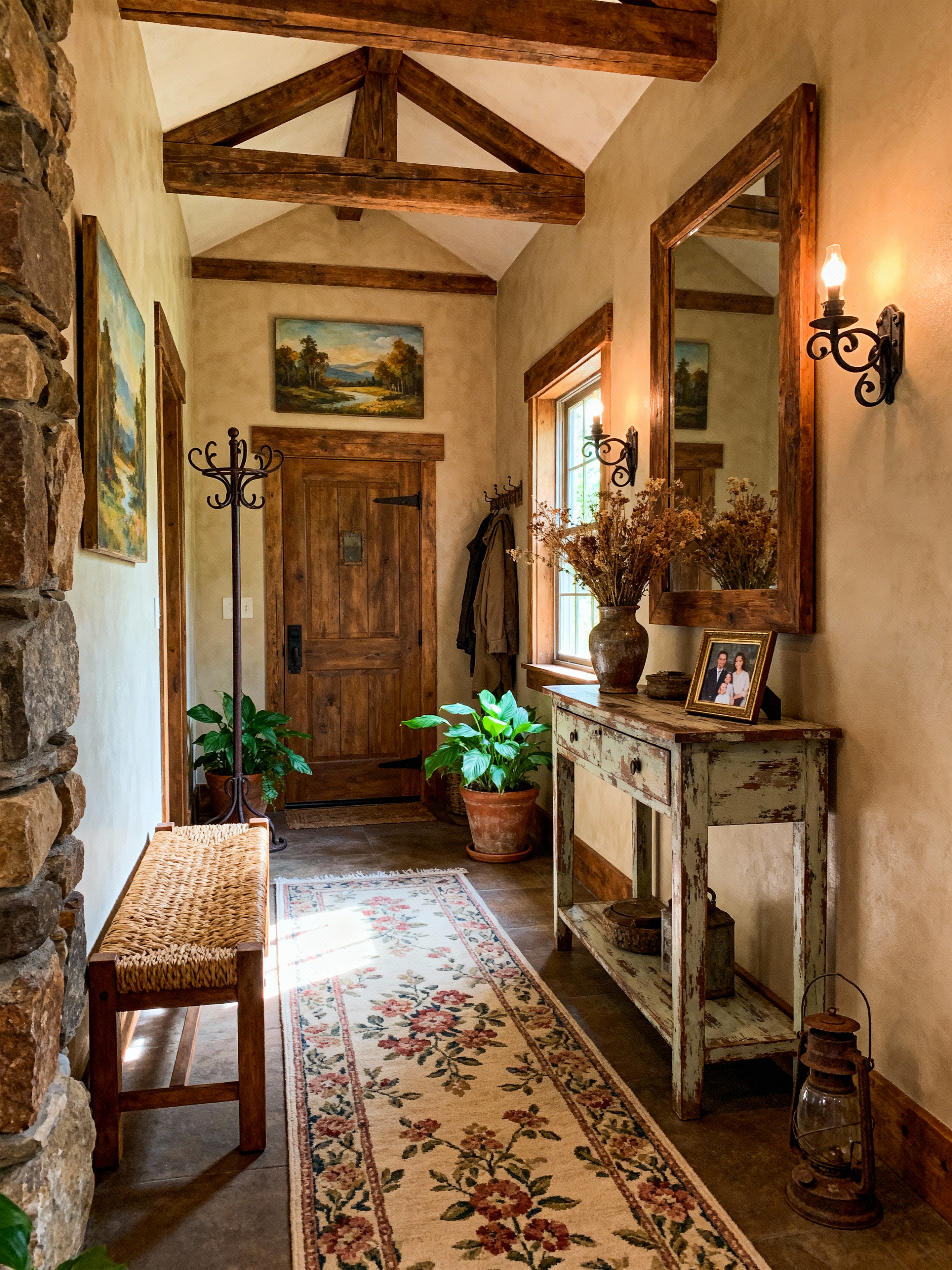 hallway with rustic style with wall sconces and bench and mirror and console table and wall art and coat rack and runner rug and plant. . with country style and distressed finishes and stone accents and warmth and woven textures and cozy cabin and exposed beams and vintage decor