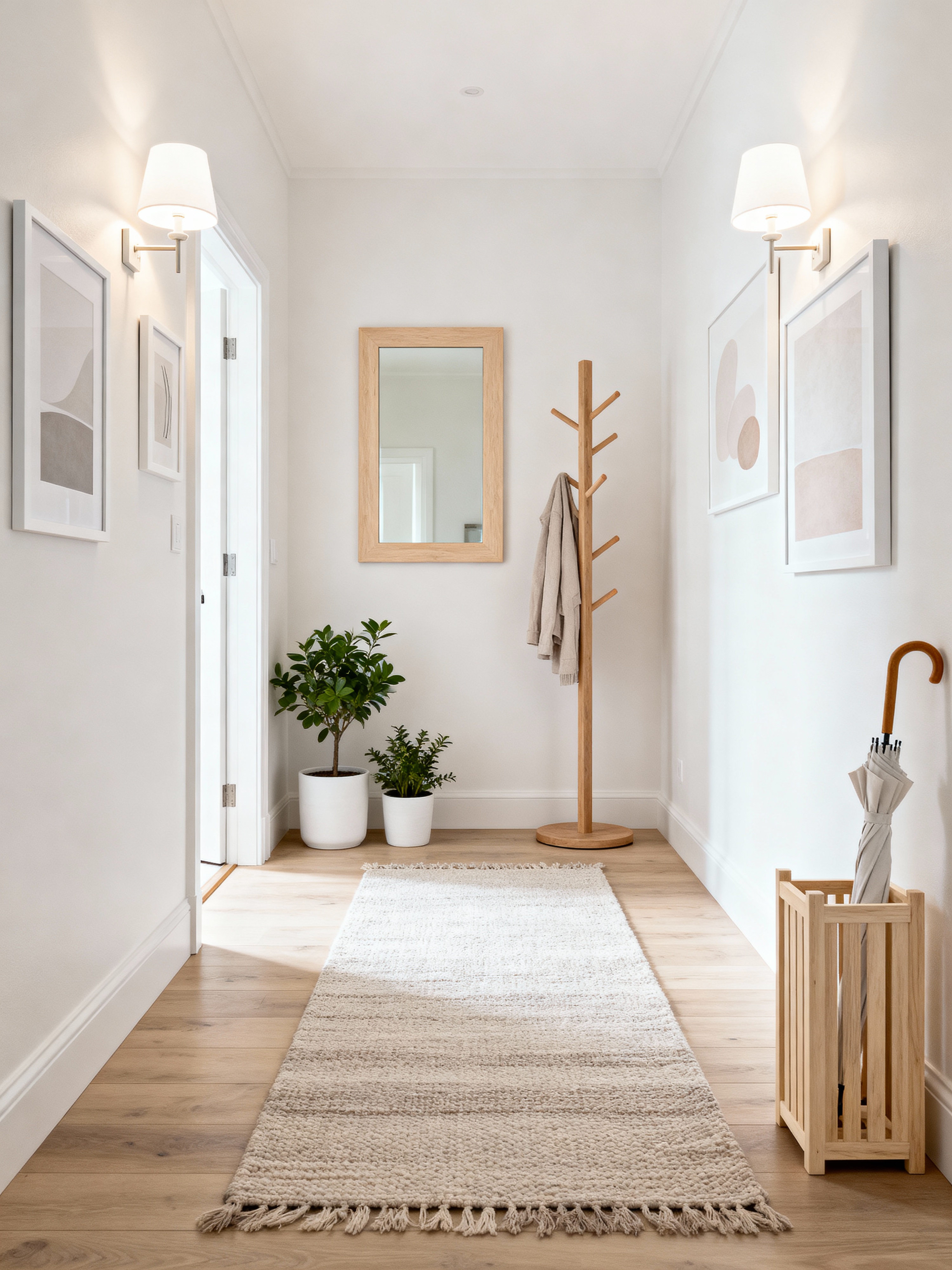 hallway with scandinavian style with runner rug and coat rack and plant and picture frames and mirror and wall art and wall sconces and umbrella stand. . with light wood and neutral palette and white decor and minimalist design and textured fabrics and functional furniture and hygge and clean lines