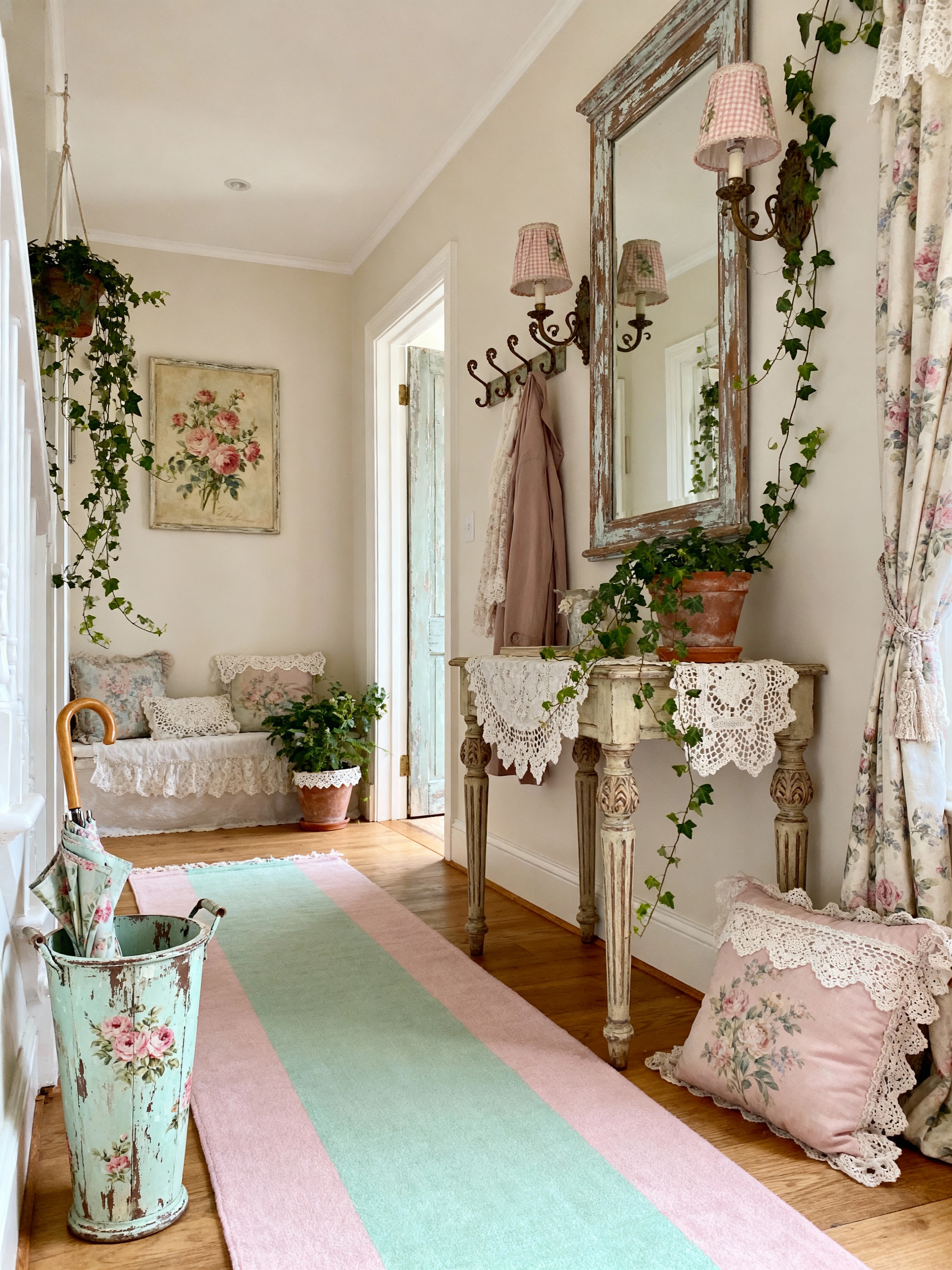 hallway with shabby chic style with umbrella stand and mirror and wall sconces and coat rack and runner rug and wall art and plant and console table. . with pastel colors and delicate details and romantic style and cottage feel and feminine touches and soft textures and antique lace and vintage charm