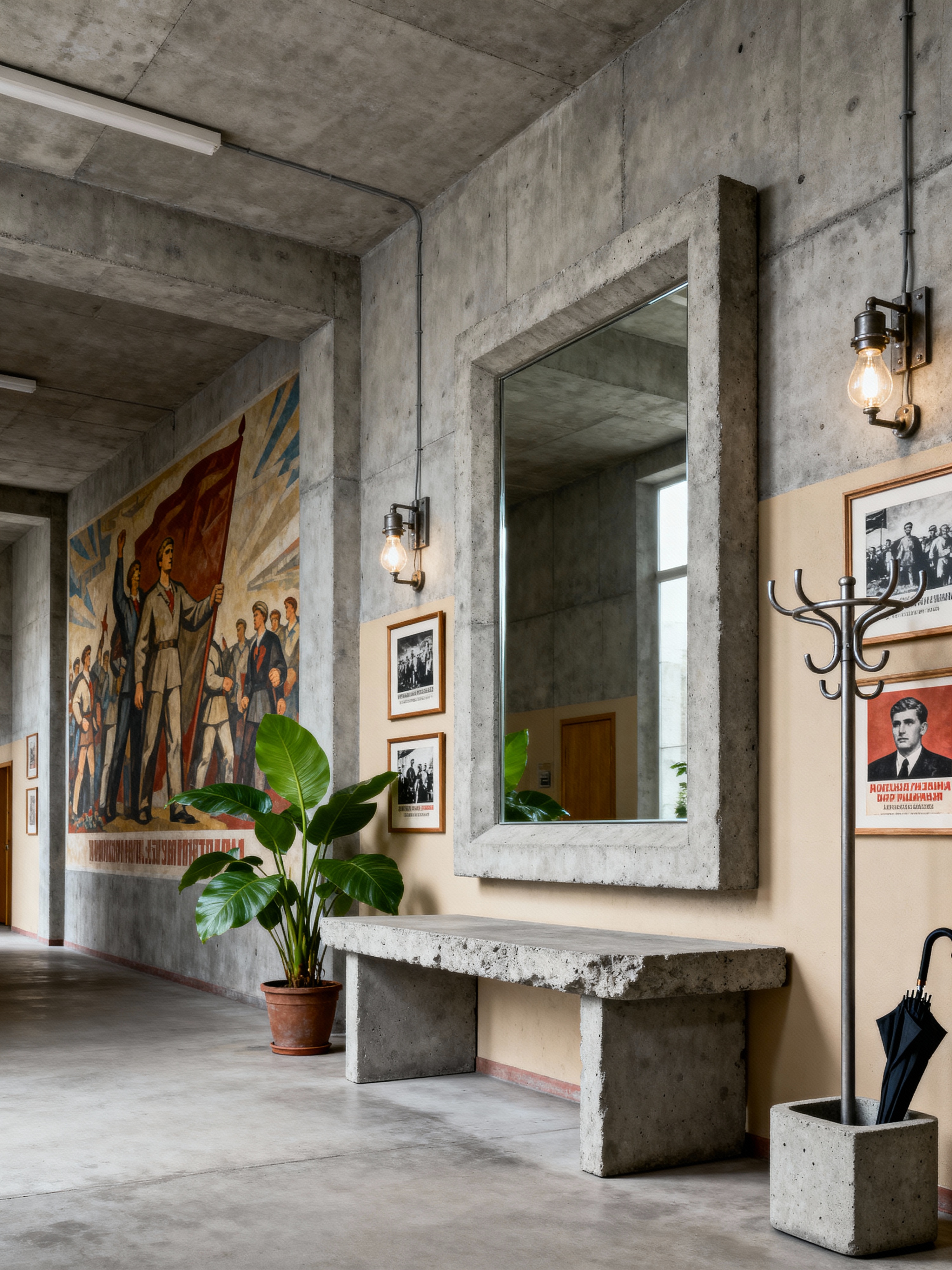 hallway with soviet style with wall art and mirror and picture frames and wall sconces and console table and plant and coat rack and umbrella stand. . with brutalist style and austere aesthetic and concrete structures and eastern bloc and institutional look and utilitarian design and socialist realism and monumental scale