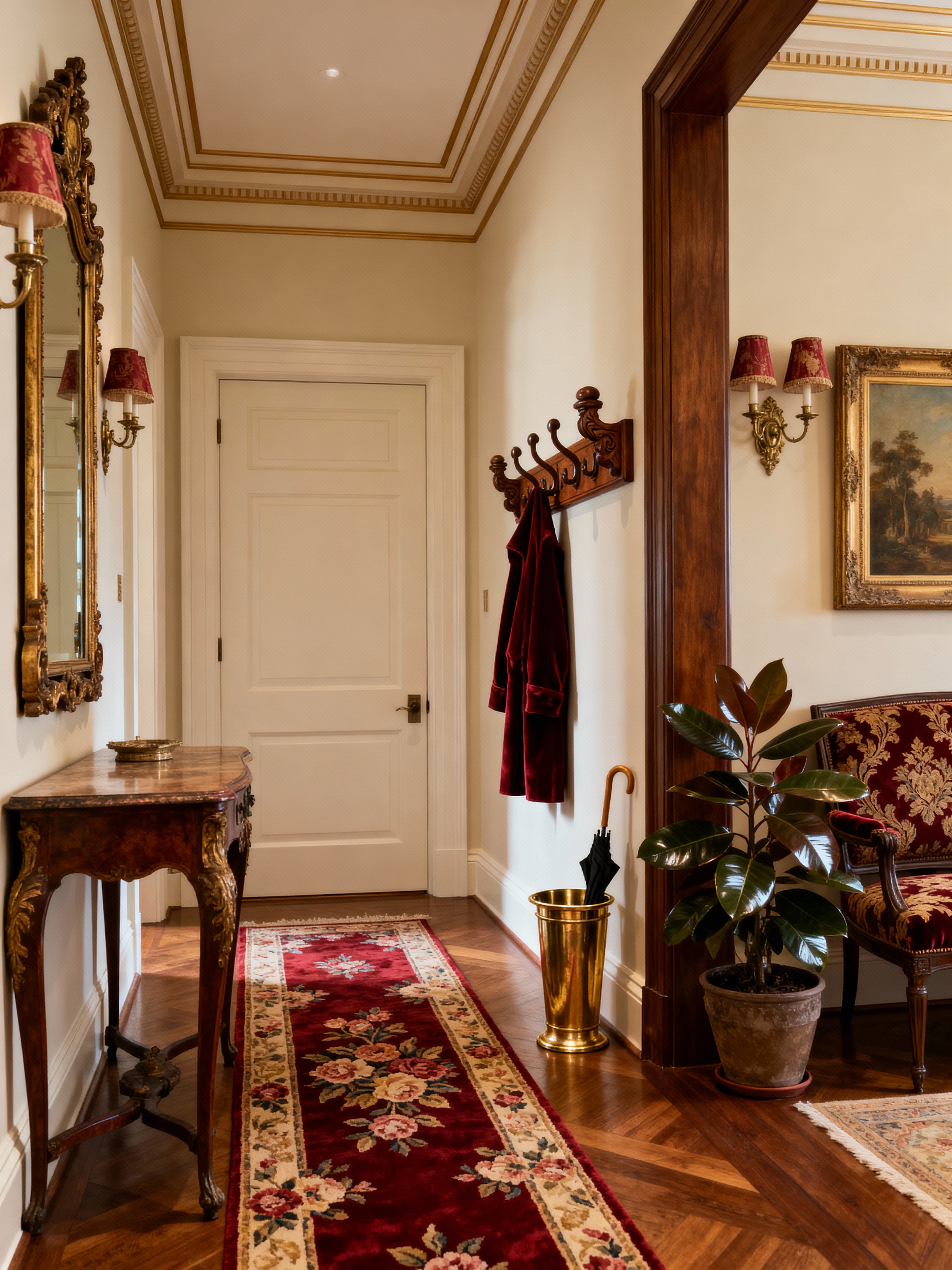 hallway with traditional style with mirror and umbrella stand and wall art and console table and runner rug and coat rack and wall sconces and plant. . with timeless design and antique pieces and warm colors and crown molding and formal furniture and rich fabrics and refined atmosphere and symmetrical layout