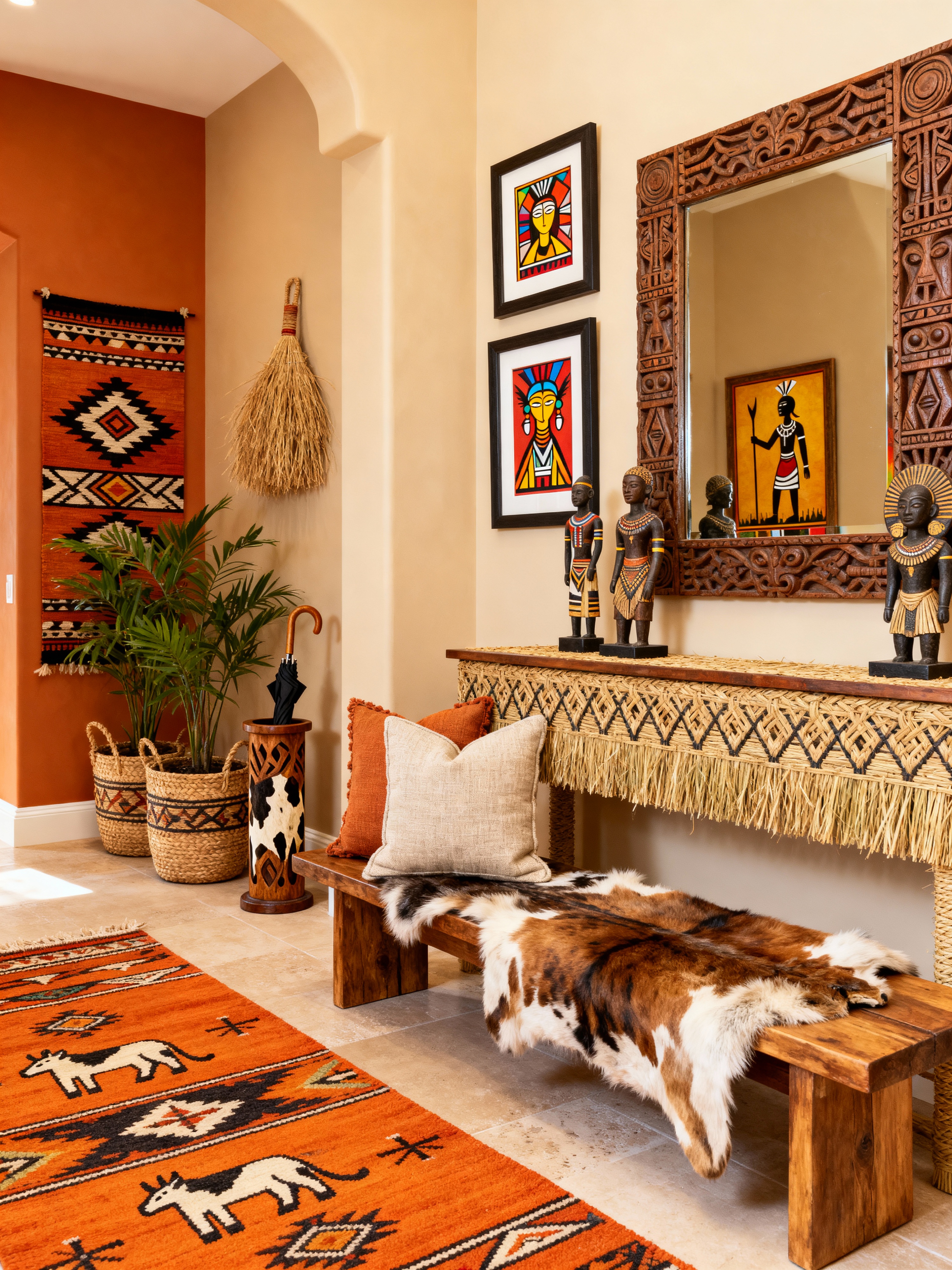hallway with tribal style with wall art and bench and plant and umbrella stand and runner rug and picture frames and console table and mirror. . with tribal patterns and animal furslinen and animal prints and exuberant splashes of colour and intricate grass weaving and sculptures and artworks and tribal revival and desert colours