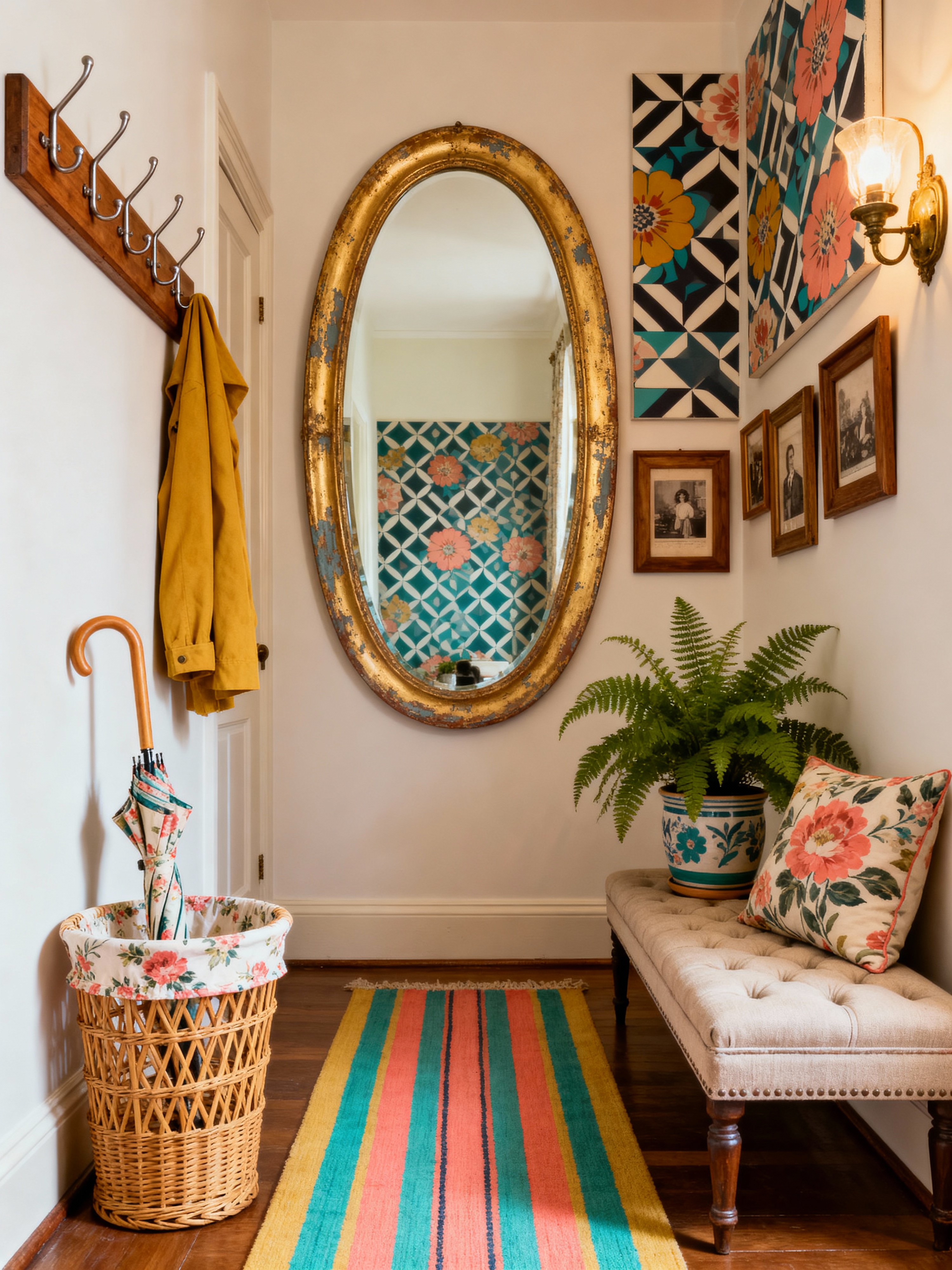 hallway with vintage style with coat rack and umbrella stand and mirror and wall art and picture frames and runner rug and bench and plant. . with shabby chic and timeless pieces and retro style and bold patterns and mid-century and antique decor and colorful accents and eclectic