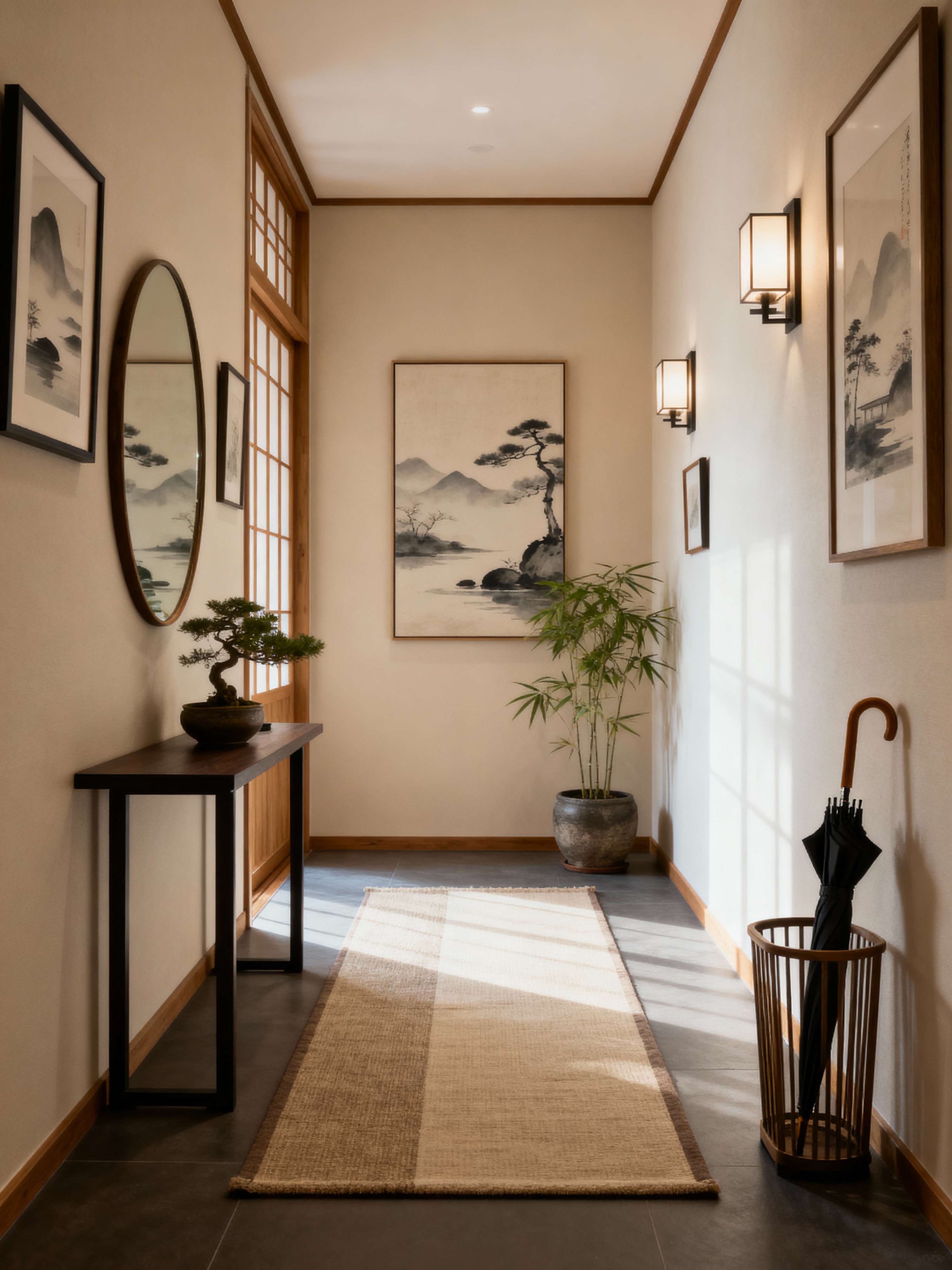 hallway with zen style with picture frames and wall art and runner rug and mirror and plant and console table and wall sconces and umbrella stand. . with asian zen interior and serenity and harmony and natural textures and simple furniture and japanese minimalist interior and japanese interior and calm and neutral colors and natural light