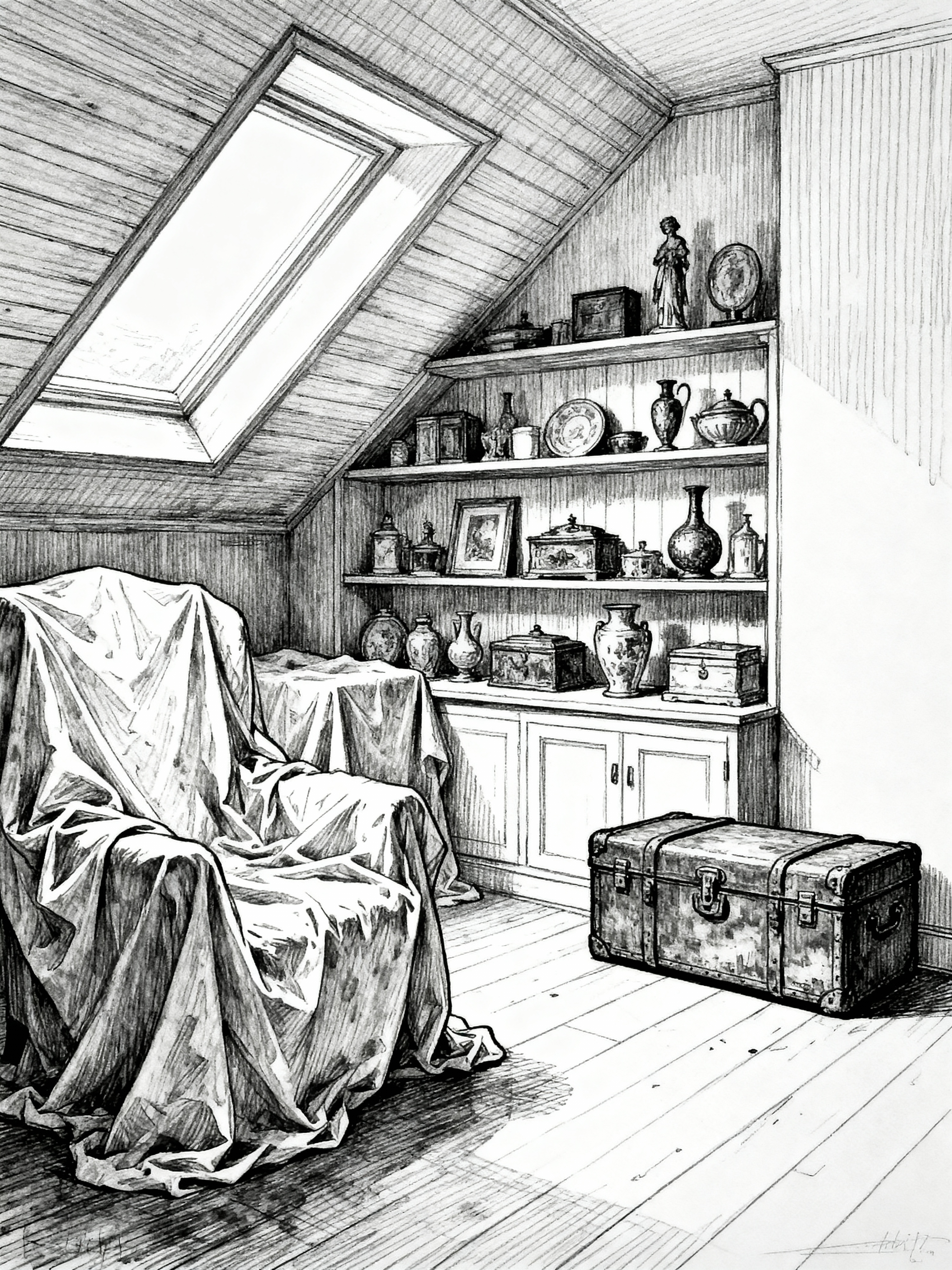 (hand-drawn monochrome black and white sketch line drawing)++ of sketch-style interior designed (attic) apartment interior. a sketch of interior. with . . a sketch of interior. with dust sheets and antique items and vintage trunk. trending on artstation. black and white line drawing sketch without colors.