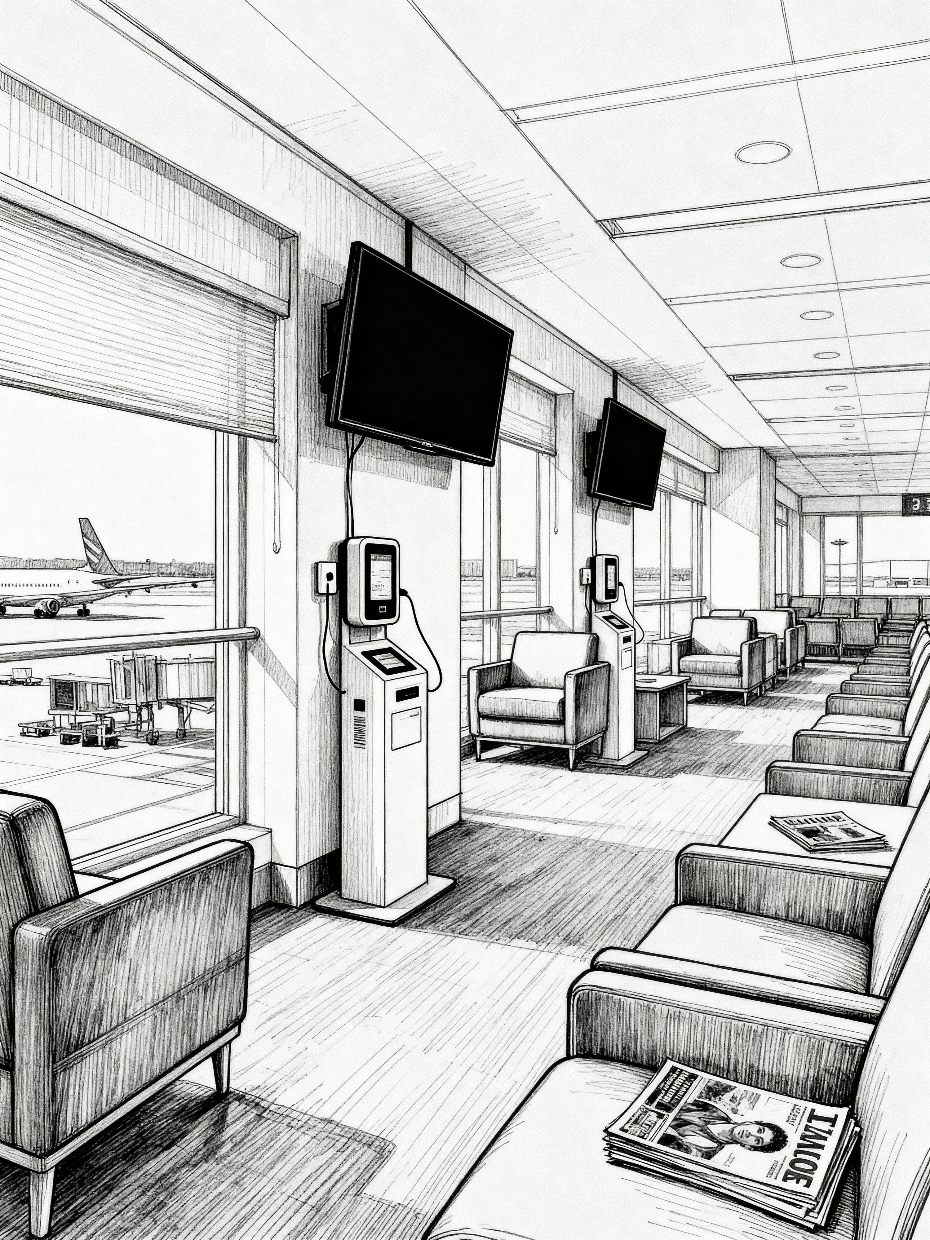 (hand-drawn monochrome black and white sketch line drawing)++ of sketch-style interior designed (airport lounge) apartment interior. a sketch of interior. with . . a sketch of interior. with television screens and charging stations and magazines. trending on artstation. black and white line drawing sketch without colors.