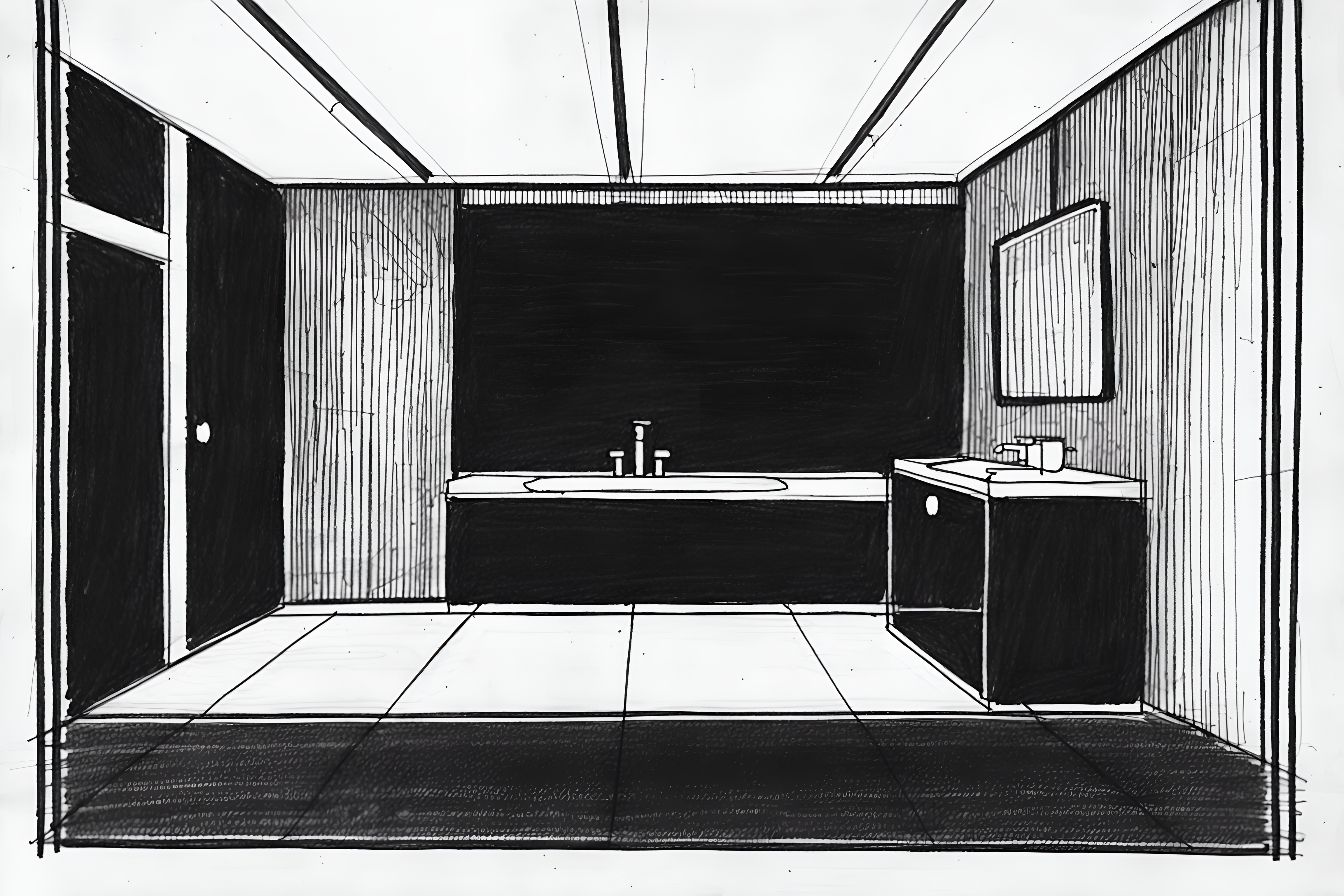sketch bathrooms(hand-drawn monochrome black and white sketch line drawing)++ of sketch-style interior designed (bathroom) apartment interior. a sketch of interior. with . . a sketch of interior. with bathroom sink with faucet and shower and mirror. trending on artstation. black and white line drawing sketch without colors.