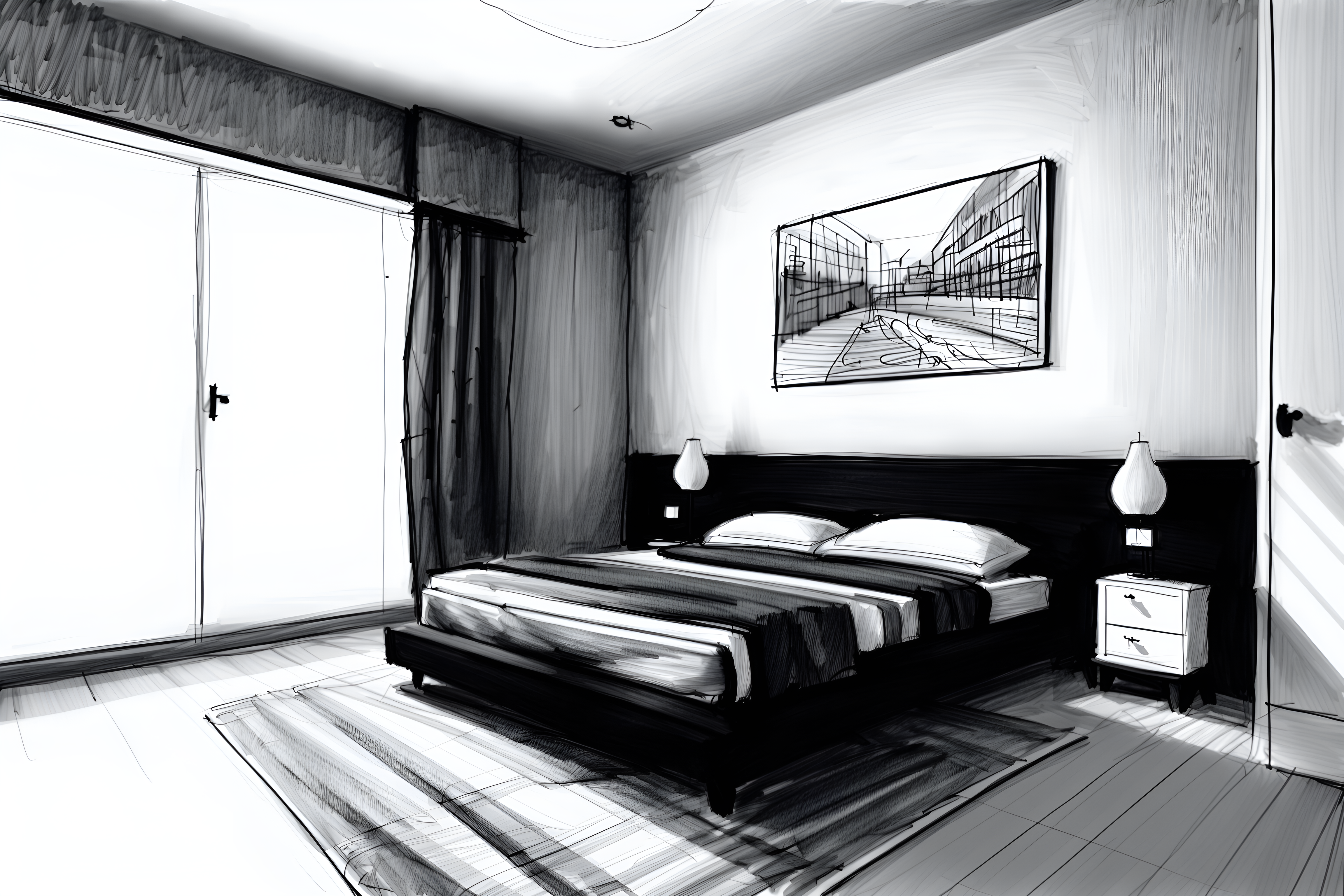 (hand-drawn monochrome black and white sketch line drawing)++ of sketch-style interior designed (bedroom) apartment interior. a sketch of interior. with . a sketch of interior. with headboard and bed and night light. trending on artstation. black and white line drawing sketch without colors. masterpiece, cinematic light, ultrarealistic+, photorealistic+, 8k, raw photo, realistic, sharp focus on eyes, (symmetrical eyes), (intact eyes), hyperrealistic, highest quality, best quality, , highly detailed, masterpiece, best quality, extremely detailed 8k wallpaper, masterpiece, best quality, ultra-detailed, best shadow, detailed background, detailed face, detailed eyes, high contrast, best illumination, detailed face, dulux, caustic, dynamic angle, detailed glow. dramatic lighting. highly detailed, insanely detailed hair, symmetrical, intricate details, professionally retouched, 8k high definition. strong bokeh. award winning photo.