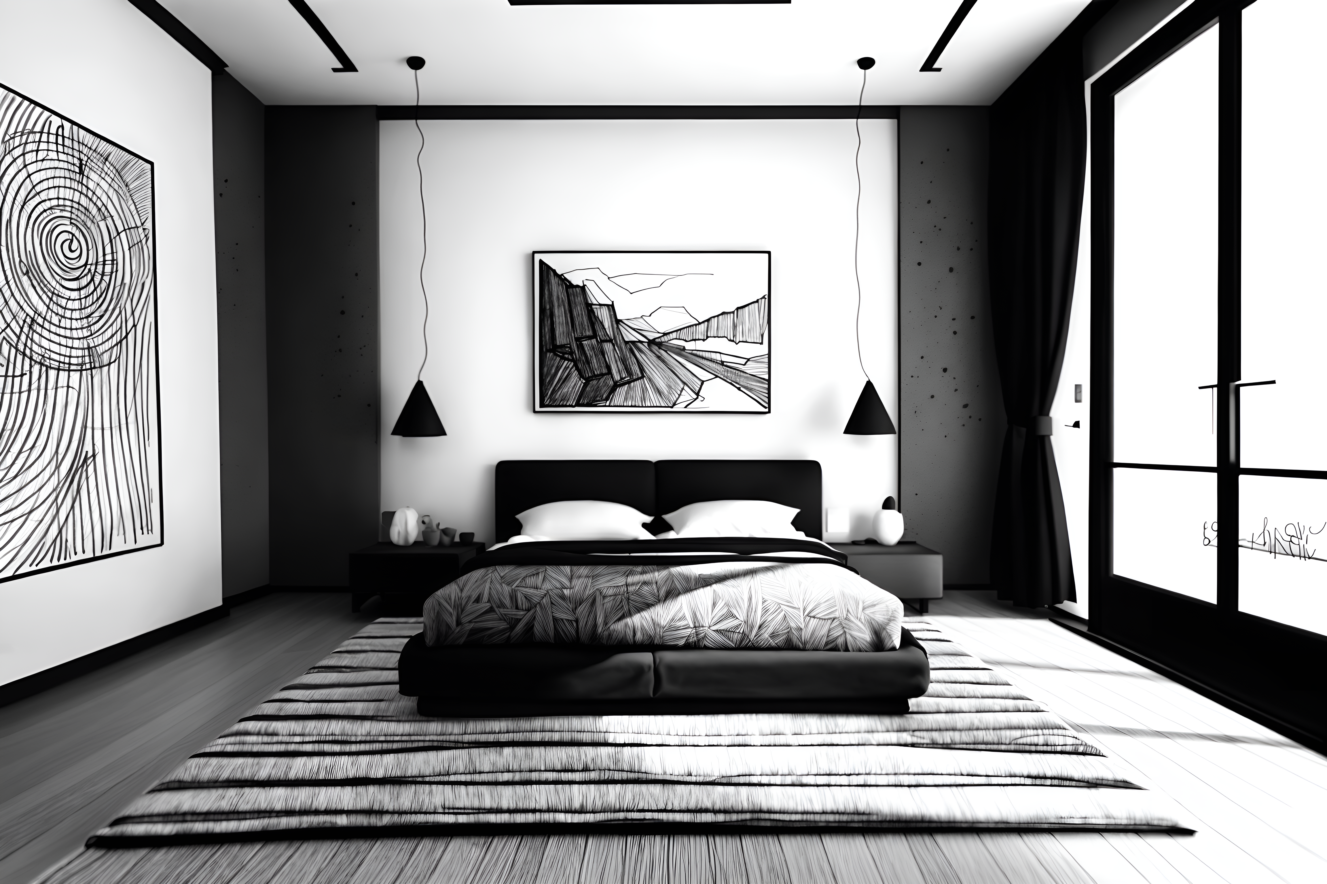(hand-drawn monochrome black and white sketch line drawing)++ of sketch-style interior designed (bedroom) apartment interior. a sketch of interior. with . a sketch of interior. with headboard and bed and night light. trending on artstation. black and white line drawing sketch without colors. masterpiece, cinematic light, ultrarealistic+, photorealistic+, 8k, raw photo, realistic, sharp focus on eyes, (symmetrical eyes), (intact eyes), hyperrealistic, highest quality, best quality, , highly detailed, masterpiece, best quality, extremely detailed 8k wallpaper, masterpiece, best quality, ultra-detailed, best shadow, detailed background, detailed face, detailed eyes, high contrast, best illumination, detailed face, dulux, caustic, dynamic angle, detailed glow. dramatic lighting. highly detailed, insanely detailed hair, symmetrical, intricate details, professionally retouched, 8k high definition. strong bokeh. award winning photo.