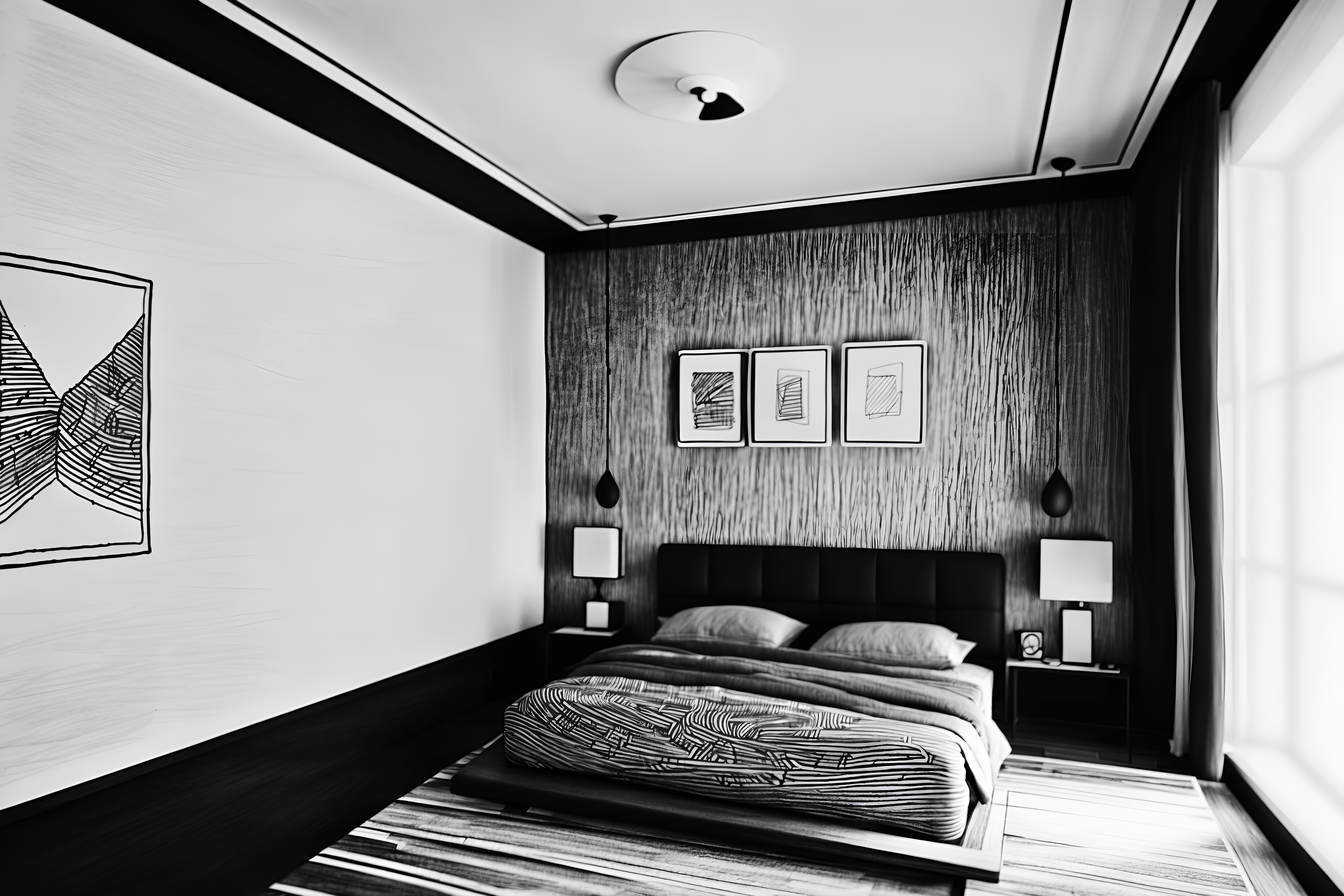 (hand-drawn monochrome black and white sketch line drawing)++ of sketch-style interior designed (bedroom) apartment interior. a sketch of interior. with . a sketch of interior. with headboard and bed and night light. trending on artstation. black and white line drawing sketch without colors. masterpiece, cinematic light, ultrarealistic+, photorealistic+, 8k, raw photo, realistic, sharp focus on eyes, (symmetrical eyes), (intact eyes), hyperrealistic, highest quality, best quality, , highly detailed, masterpiece, best quality, extremely detailed 8k wallpaper, masterpiece, best quality, ultra-detailed, best shadow, detailed background, detailed face, detailed eyes, high contrast, best illumination, detailed face, dulux, caustic, dynamic angle, detailed glow. dramatic lighting. highly detailed, insanely detailed hair, symmetrical, intricate details, professionally retouched, 8k high definition. strong bokeh. award winning photo.